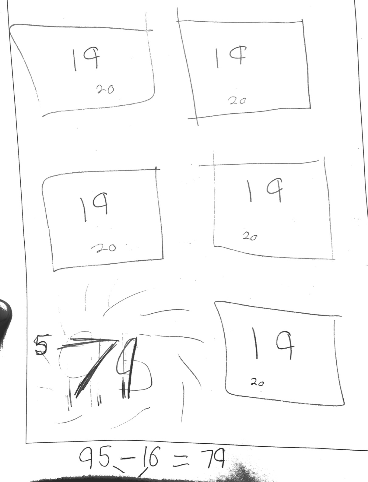 Alessia spoke first to describe her strategy, explaining how she arrived at the 95 by pointing to each of the boxes of 19/20 and taking one away. Amir spoke next, describing a little bit about how he knew to take away 4. Some students looked a little lost, so we launched into our conversation from there: how did Alessia deal with the bags of 19? How did Amir? What’s similar? What’s different?