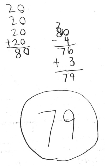“Well, I knew that I could split the 3 into three 1s. Then I could put those ones on the 9s to make 10s. 10s are the best. So now it’s 9 + 10 + 10 + 10.” He then combined the 40 + 39 to make 79.