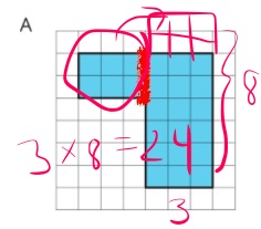 I wondered how my students would see it. I imagined most of them would image that vertical “slice” decomposing the shape and adding them. But would some envision a different slice? Or decompose it into 3 pieces? Or draw a larger 6 x 6 rectangle around the entire shape and subtract out that “missing” 3×4 array?