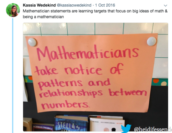 “Mathematician statements” parallel the “good reader” statements that elementary teachers may make during literacy. They illuminate and make explicit strong mathematical practices. Here’s a example from Kassia Wedekind (@kassiaowedekind)