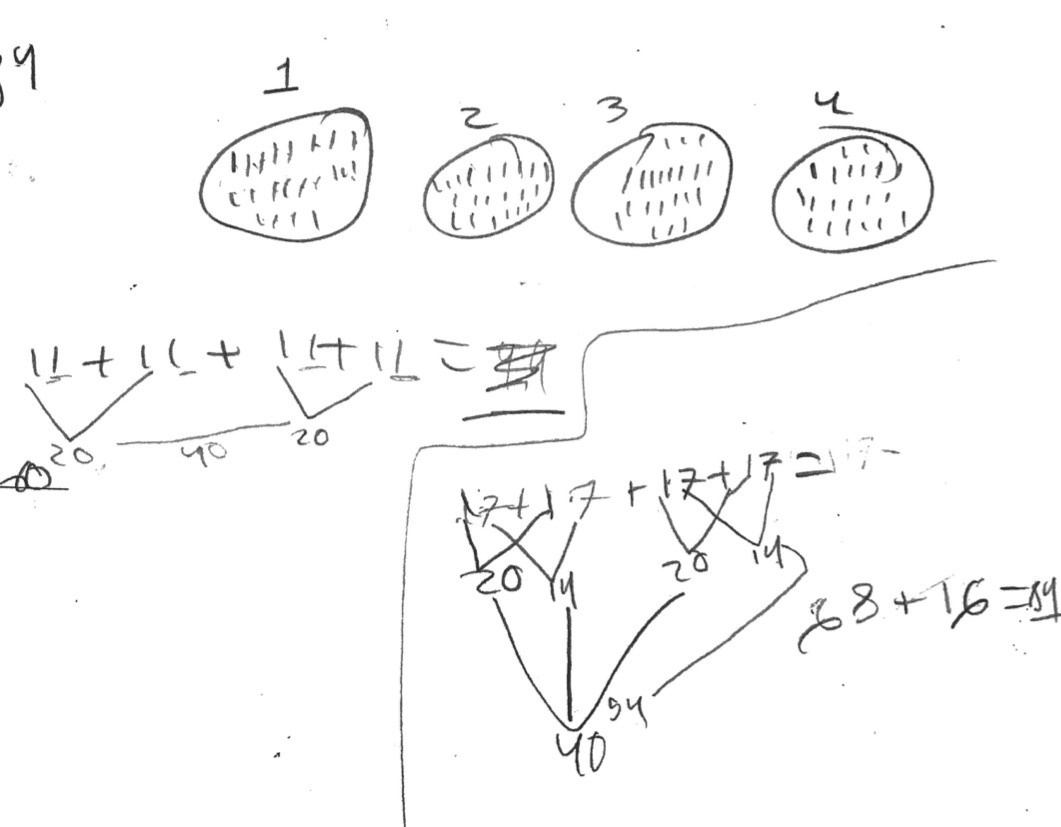 She started to combine the first two 17s, by adding the 10s and then the 1s. Nice use of partial sums. She got 34, and combined those two groups of 34 to make 68.