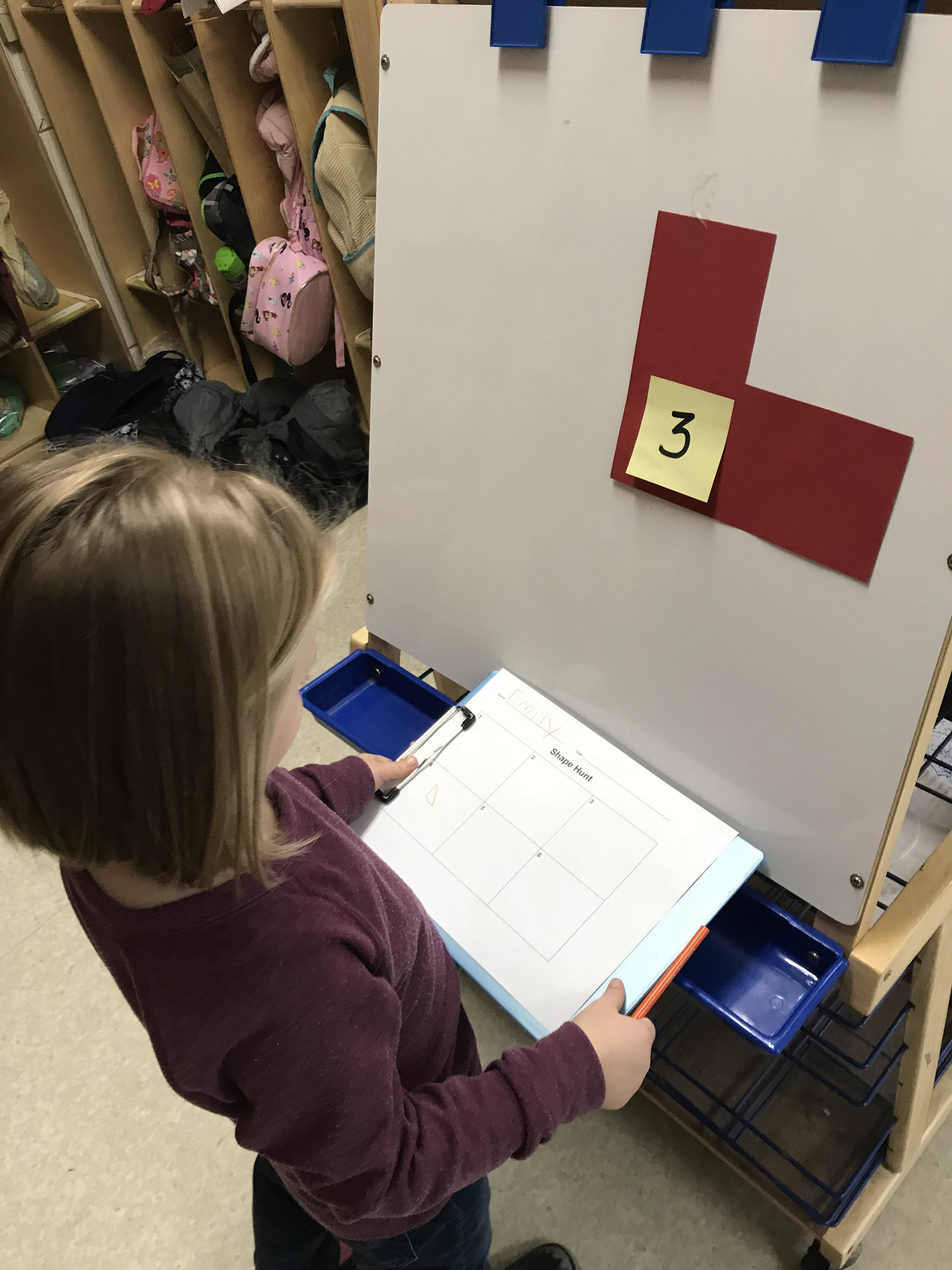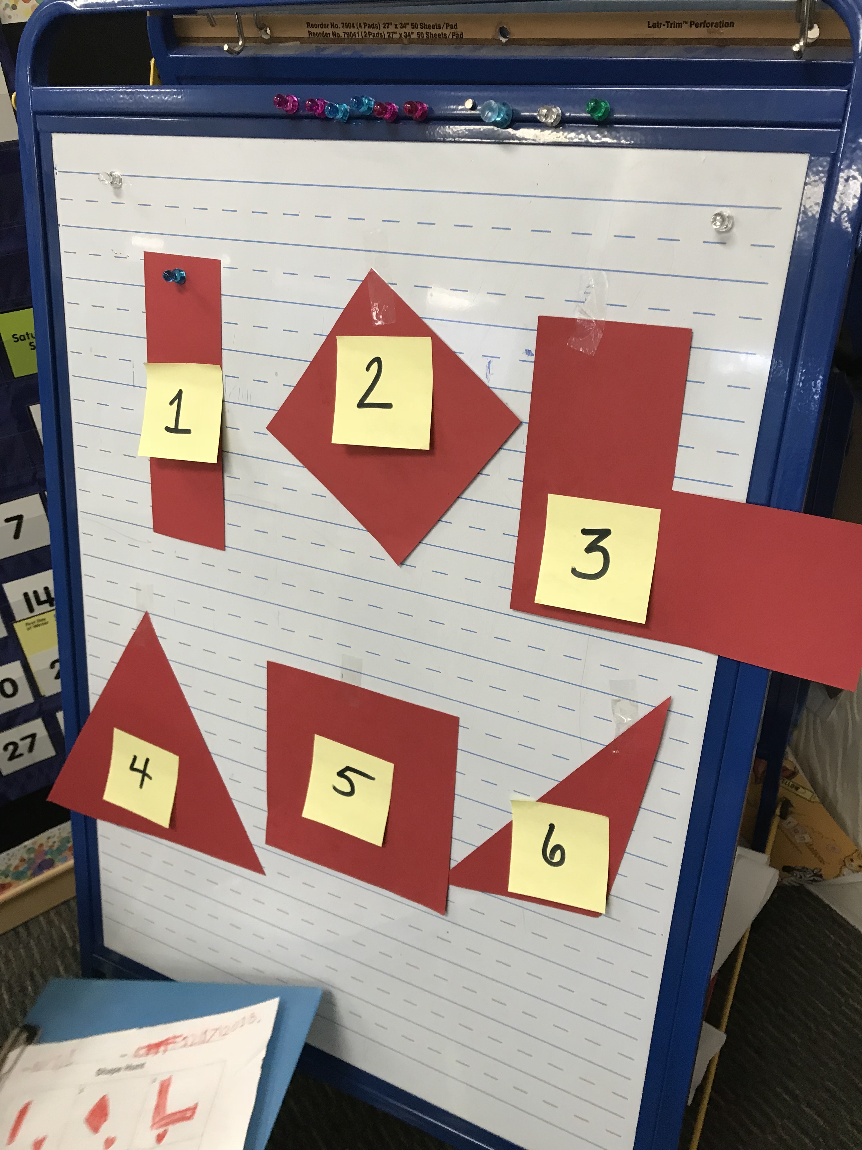 I cut out six shapes — some familiar to the kindergartners, and some less so — which Jessica and I placed strategically around the classroom.