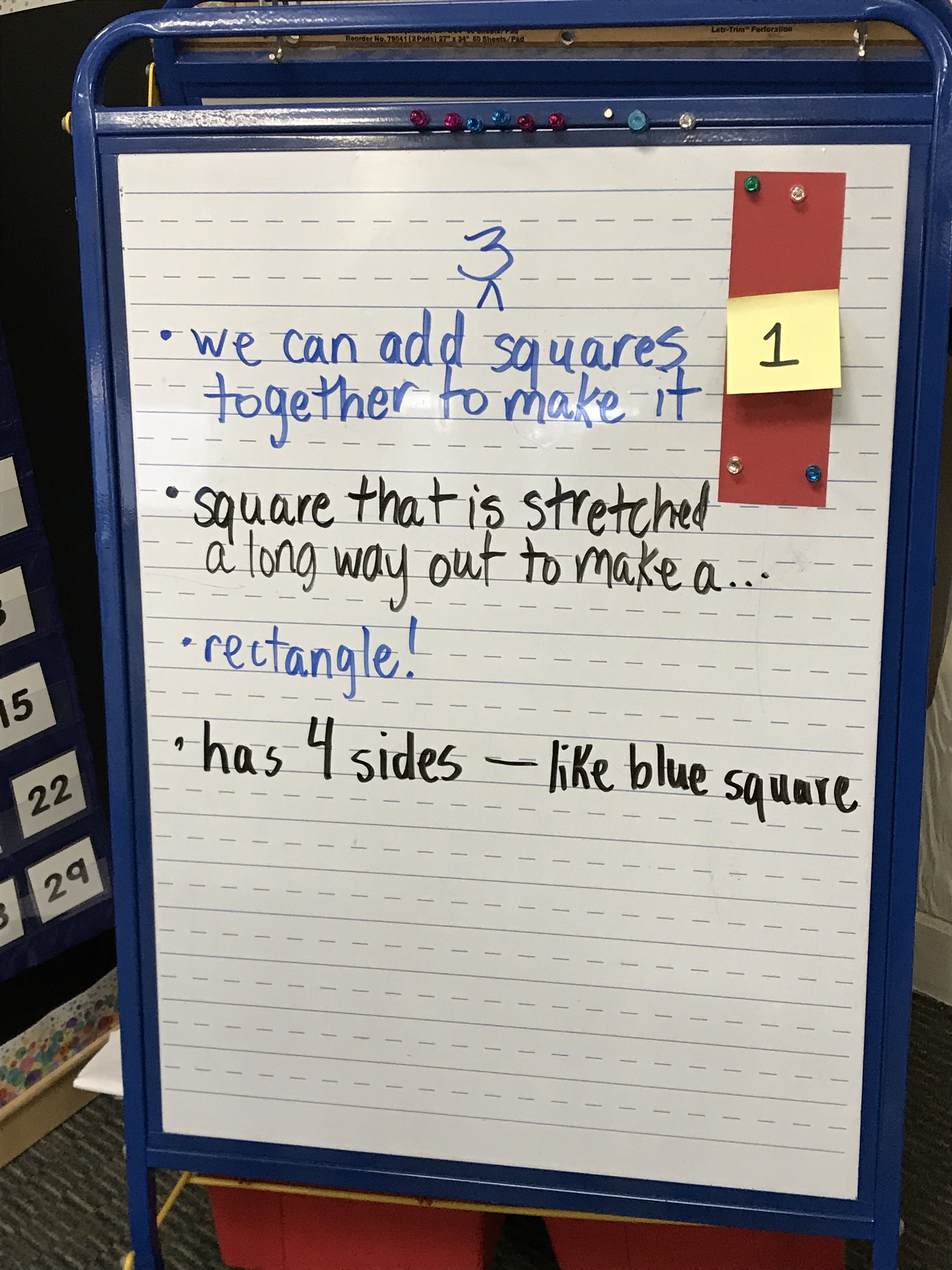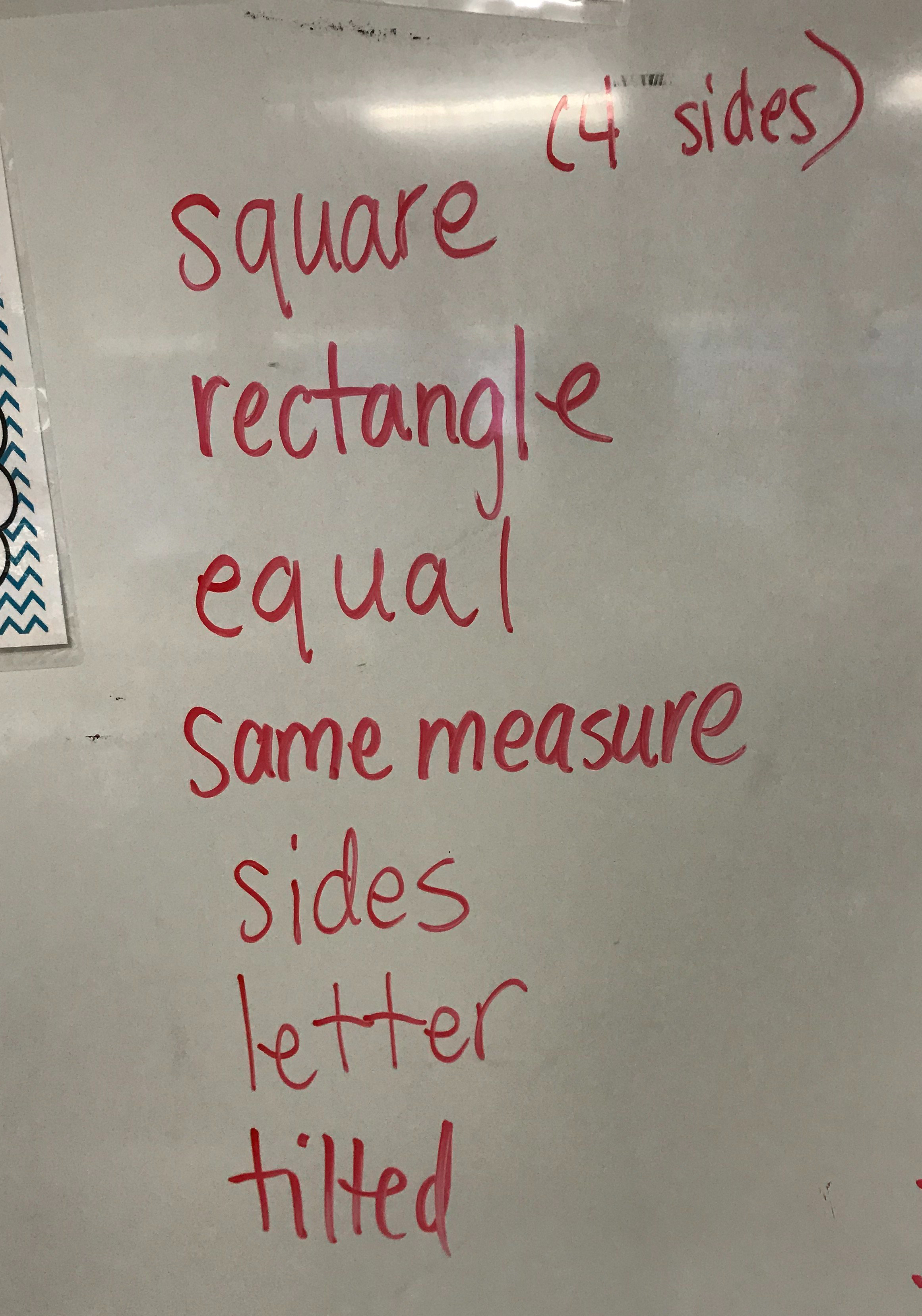 “Yes, it does remind me of a square,” I murmured while recording Gianna’s thinking on the board. “What parts of this shape remind you of a square?”