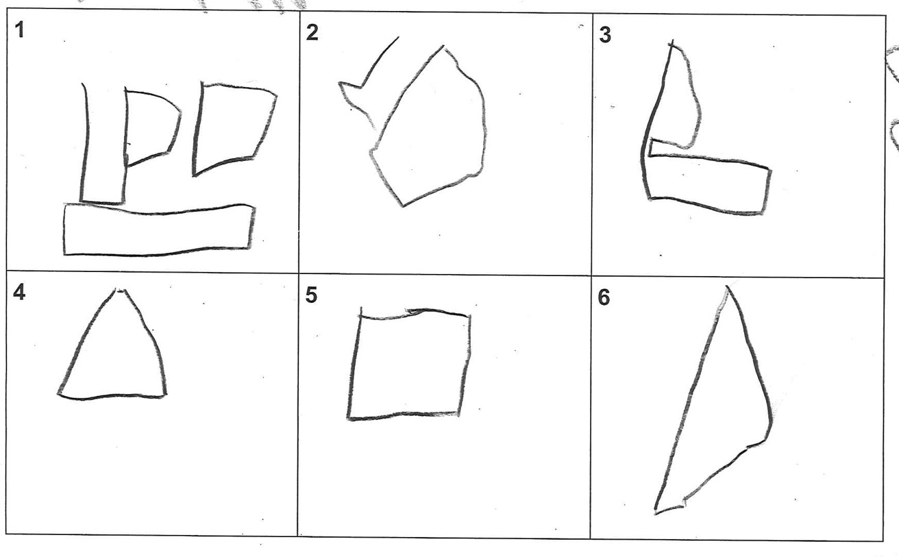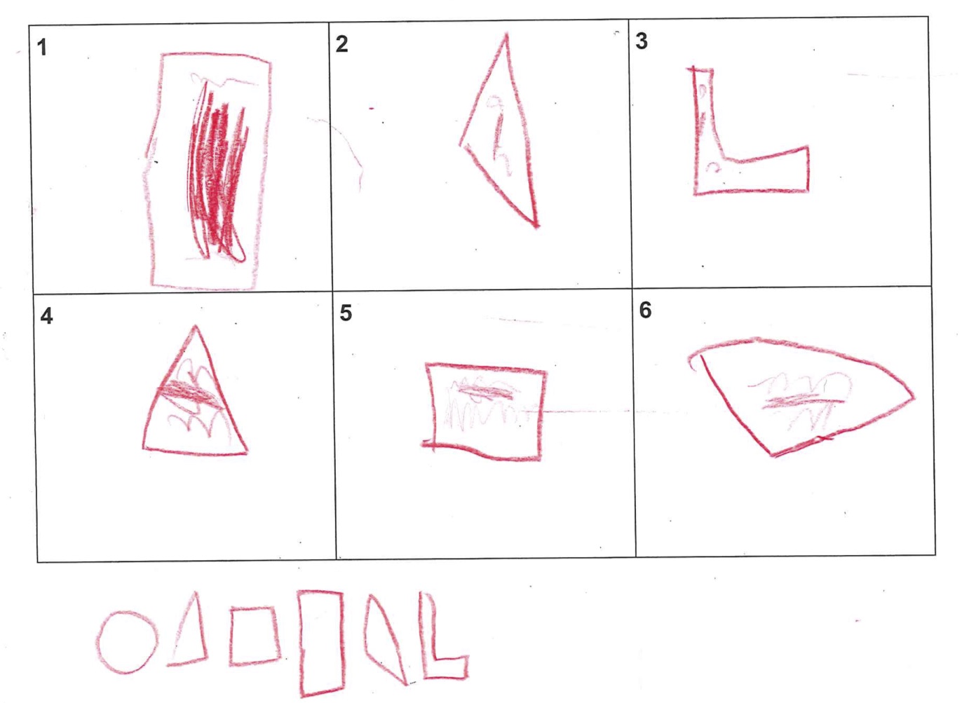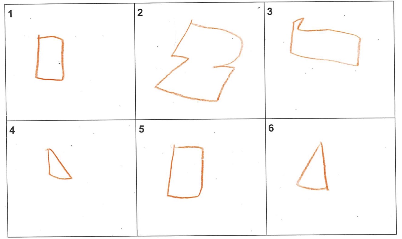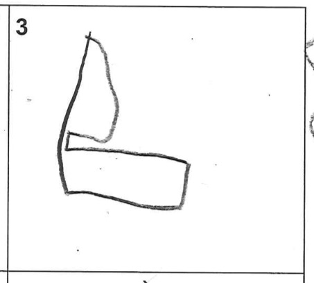 Here’s Gianna’s sketch of shape #3. To us, it looks like she sees it as two figures, possibly two rectangles. It looks like she drew the lower one, and started to close the shape before veering back out to show the upper rectangle. Her lower rectangle features straight(ish) lines and sharp 90 degree(ish) angles. The upper one is anemic and curved.