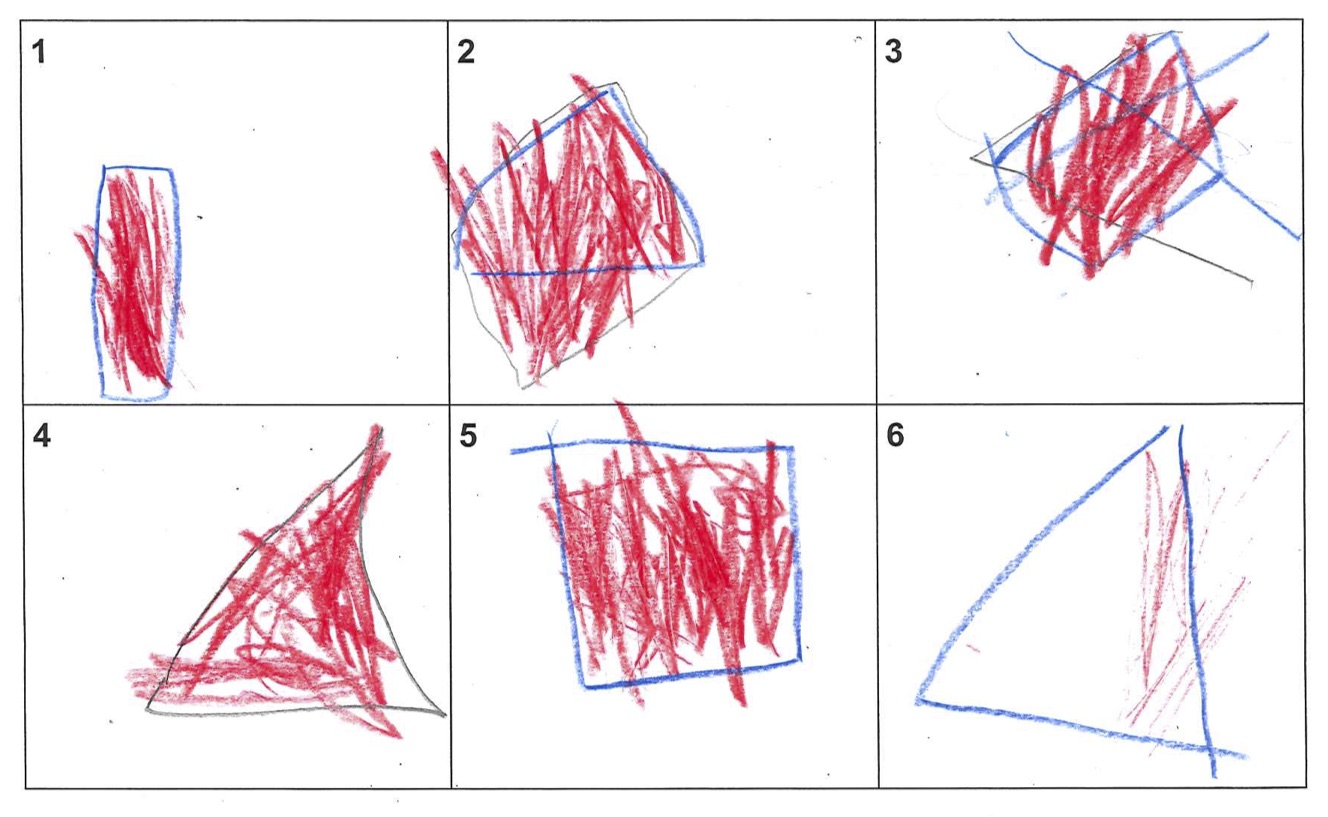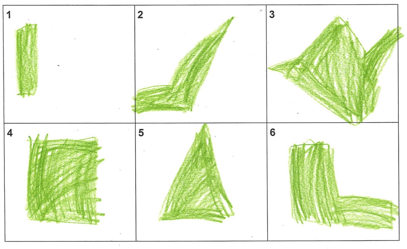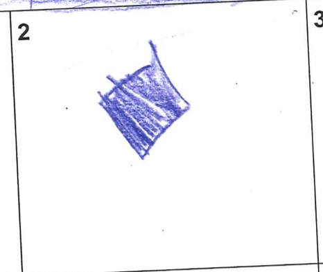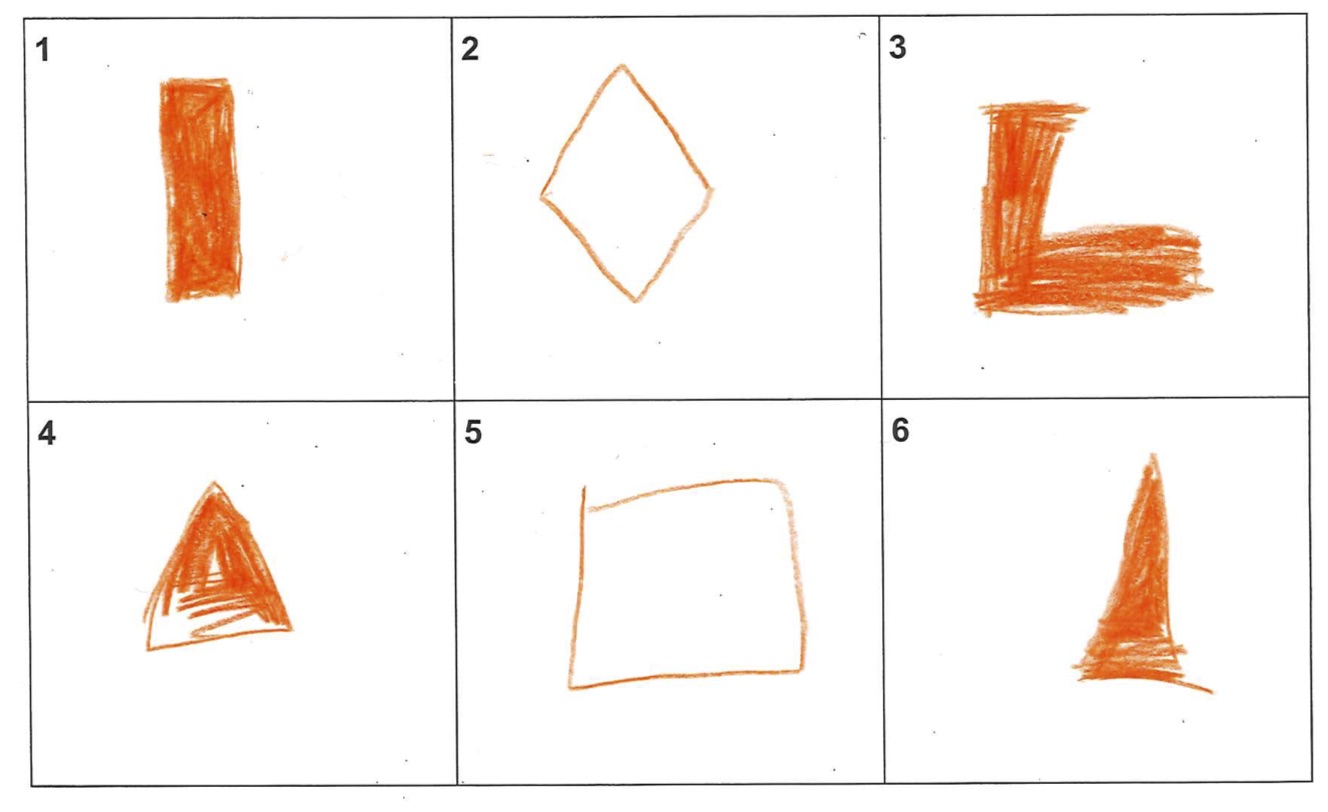 Here’s Gianna’s sketch of shape #3. To us, it looks like she sees it as two figures, possibly two rectangles. It looks like she drew the lower one, and started to close the shape before veering back out to show the upper rectangle. Her lower rectangle features straight(ish) lines and sharp 90 degree(ish) angles. The upper one is anemic and curved.
