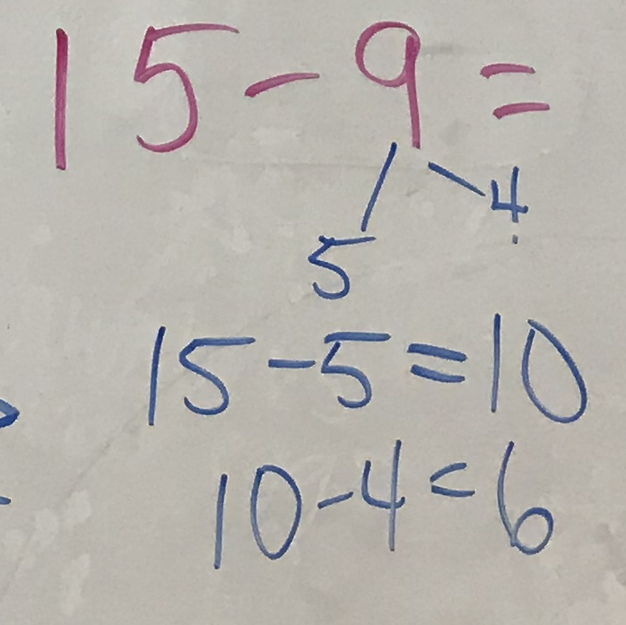 We were working on 15 – 9. Edward had already shared his thinking: “I break up the 9 into 5 and 4, because I know 15-5=10. Then minus the 4 and it’s 6.” I had annotated his thinking on the board.
