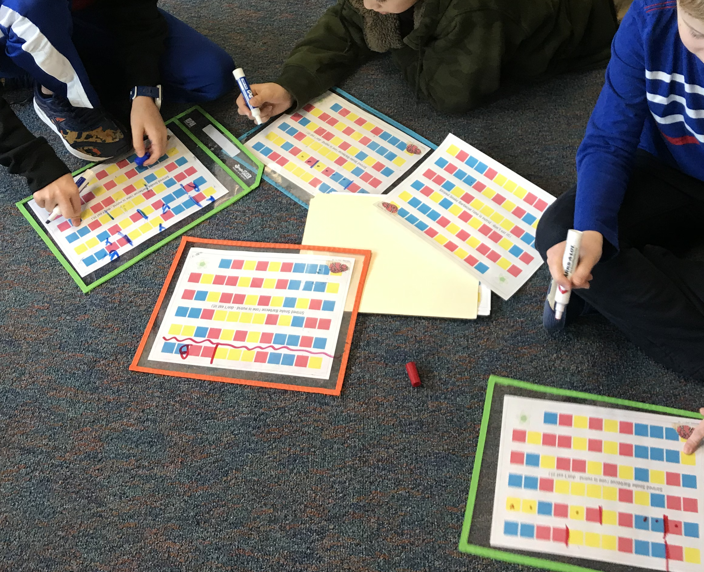 Students worked using “SmartPals” (transparent dry erase pockets). I could see this working with the puzzles tucked into sheet protectors, or even with paper and pencil. The colors make it easier to access, but I imagine it could be done in grayscale, too. There is a black & white version available on MathPickle.com.