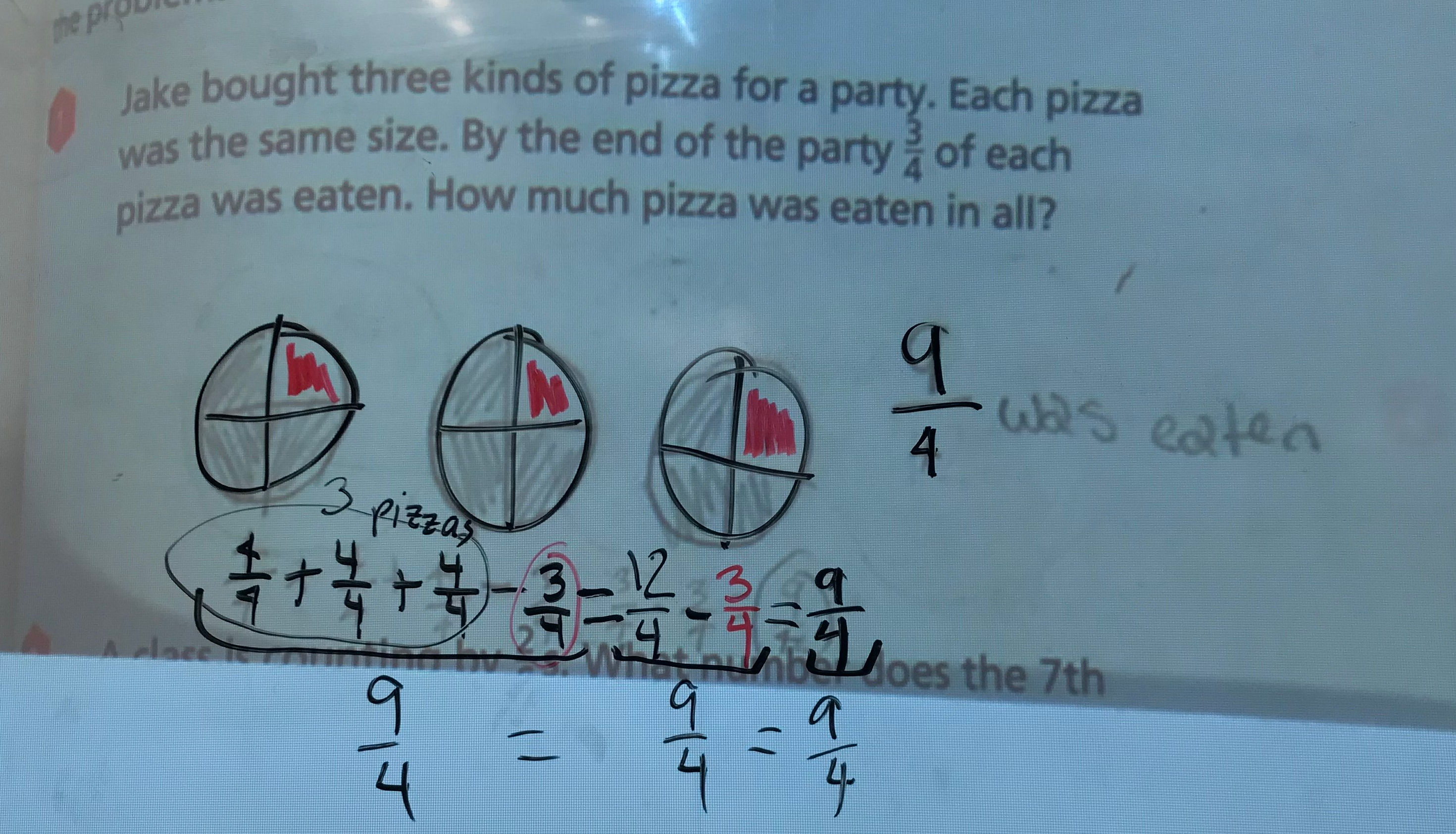 The pizza task, despite having a different context, involved most of the same numbers: 3 groups of 3/4. Some students had written the answer as 9/4, and others as 2 1/4, but all of the answers were equivalent.