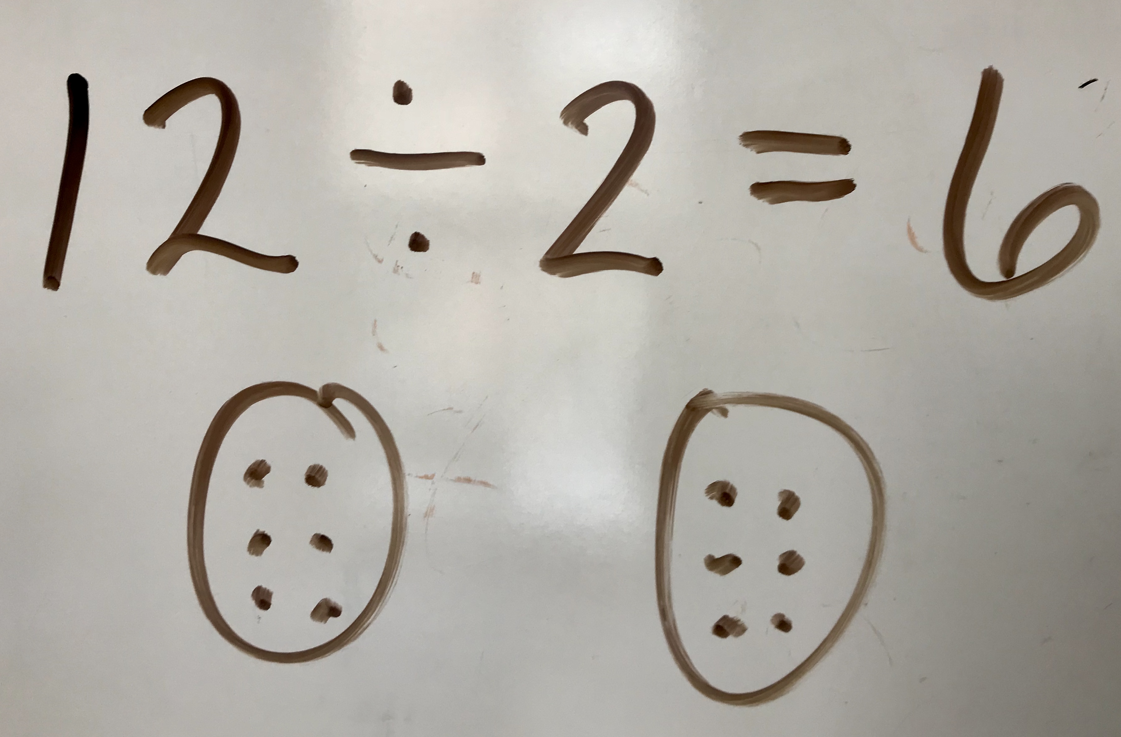 The next day, we recounted the story in a problem string. We focused on understanding division as sharing. 12 ÷ 2 is like 12 cookies shared among two people. I drew two circles (plates), and then distributed the cookies out.