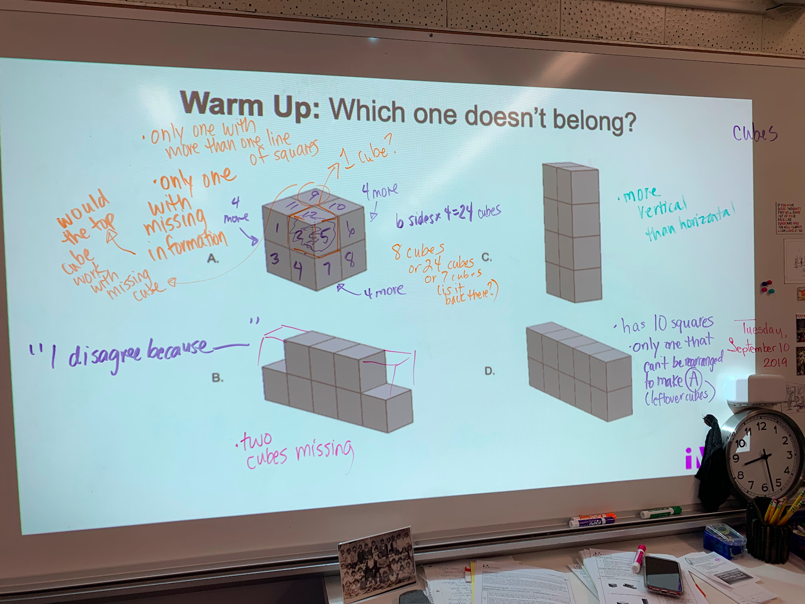 In the first classroom, a student said that that the cube did not belong because it was the only one that was missing information. Huh. I asked the student to explain further.
