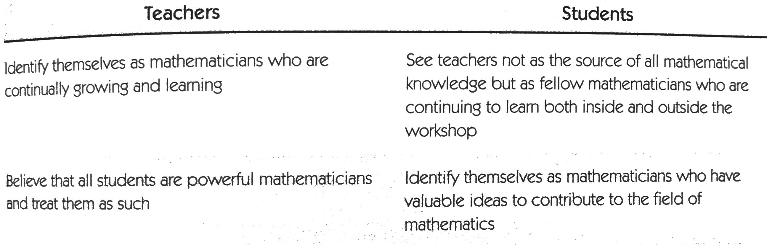 Students should see teachers not as a source of mathematical knowledge, but as fellow mathematicians who are continuing to learn both inside and outside the workshop.
