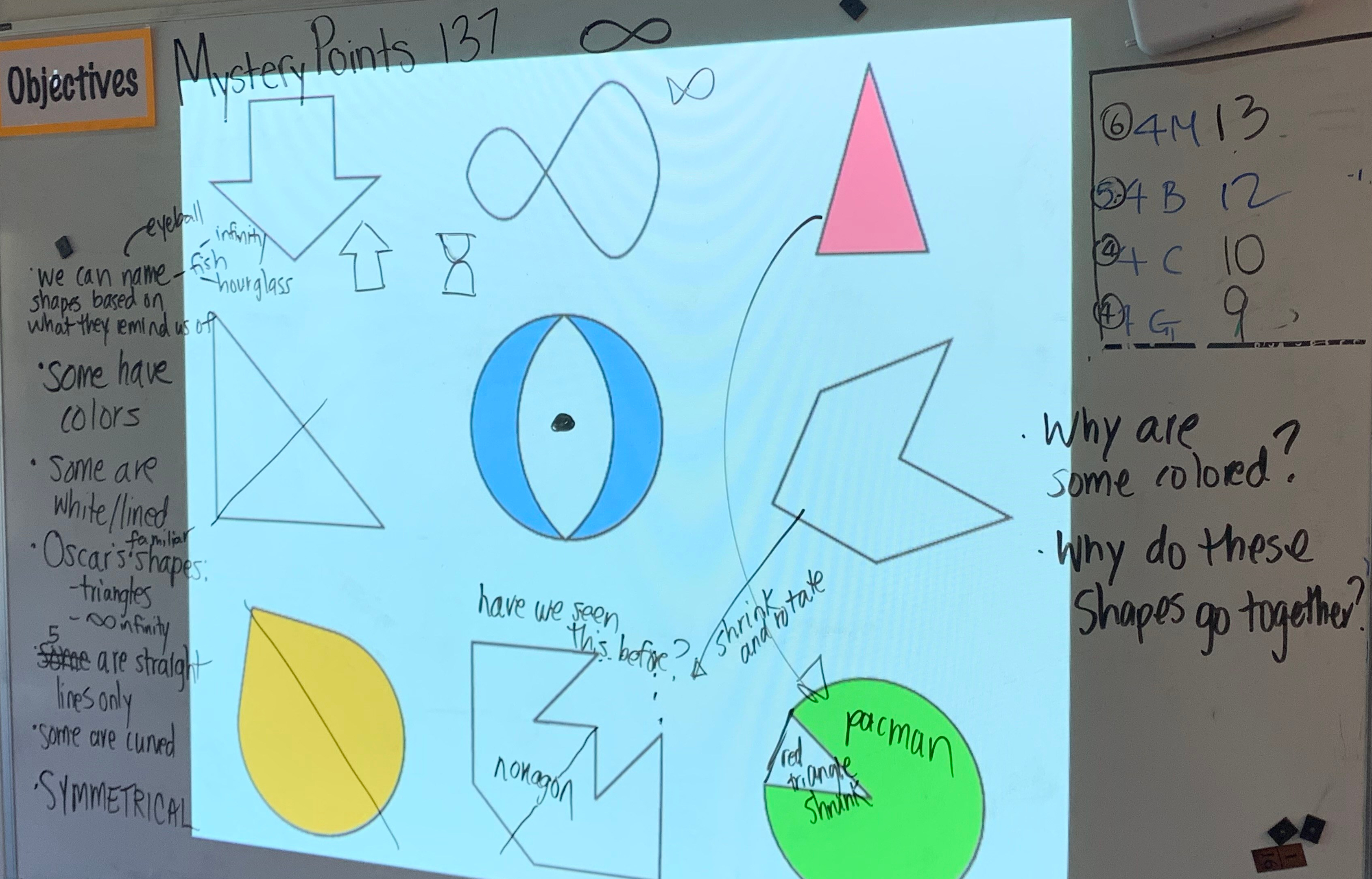“Why do these shapes all go together?” One student asked. This is exactly where I had wanted to bring the class: that these shapes do have a feature in common. If a student hadn’t asked that question, I would have introduced the idea of a common feature to transition us to this thinking, especially since symmetry had not come up yet.