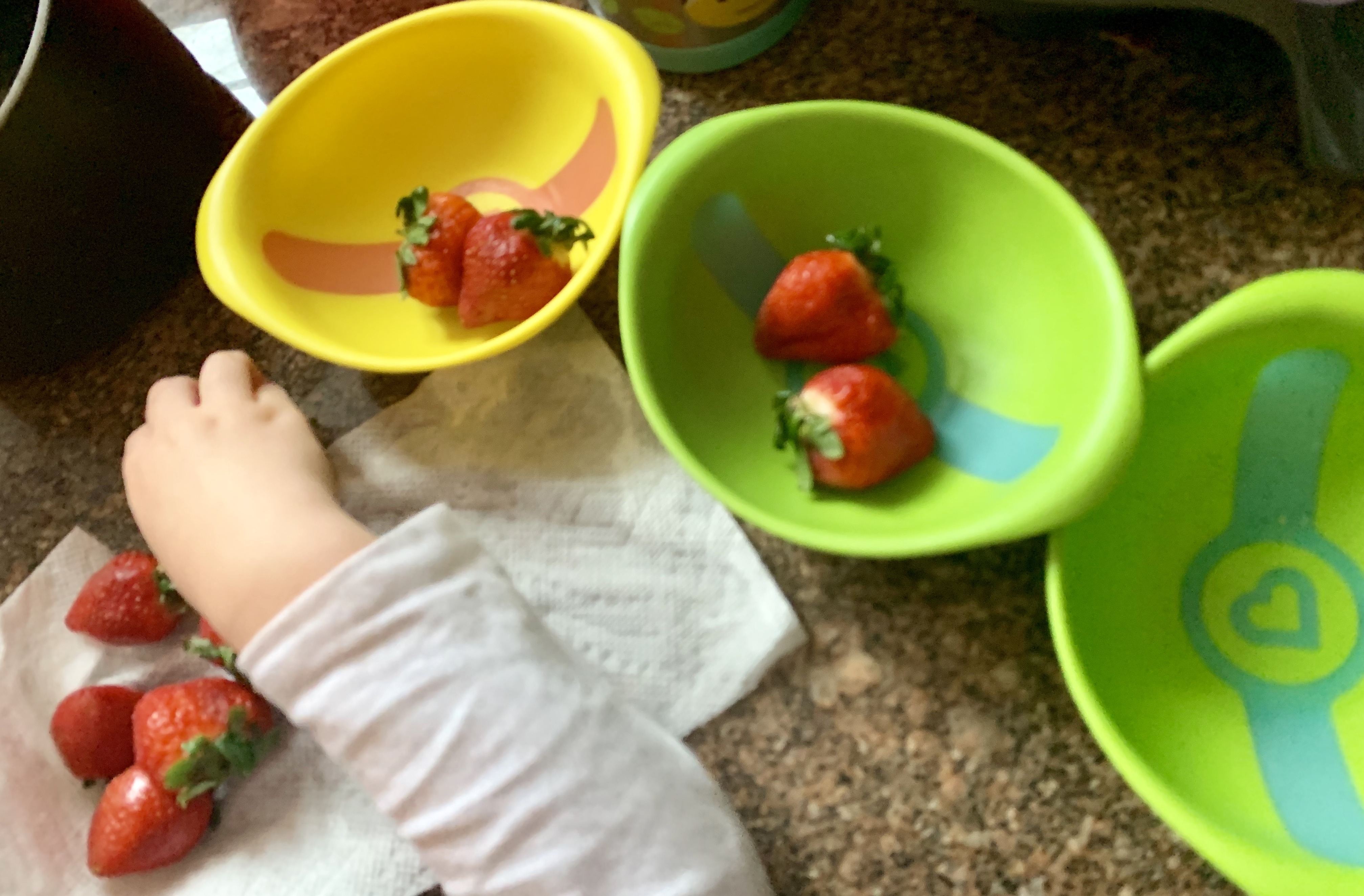My daughter lit up with memories from the previous day. “Get out some bowls,” she demanded. She pointed to herself, then to Leo, and Leo’s mom. “One, two, three. Three bowls.” I thought she might place a fistful of strawberries in the bowl, but instead I saw her start to partition them into groups.