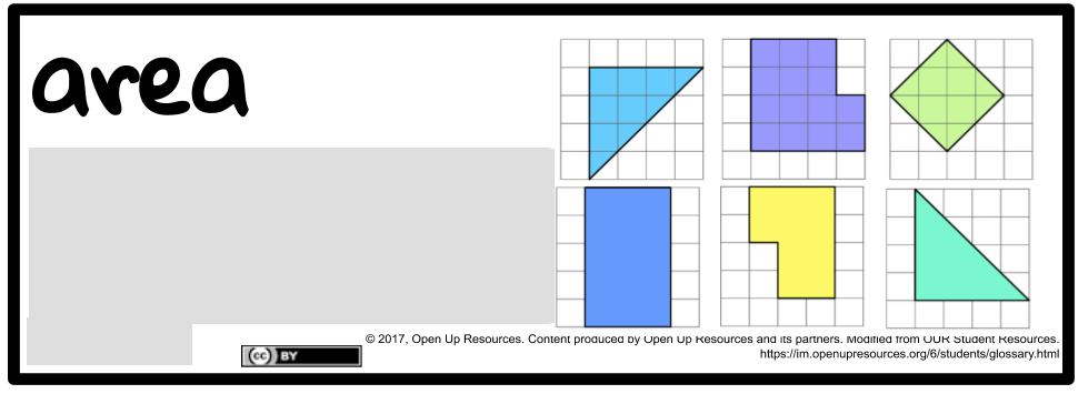 I told students that area is measuring how much space a surface covers. We would build on this idea the following day. For this particular lesson, I removed the definition from the word wall card (shown above). Students were still building their informal definitions, and I did not want to disrupt that process. I revealed the full definition the the following day.