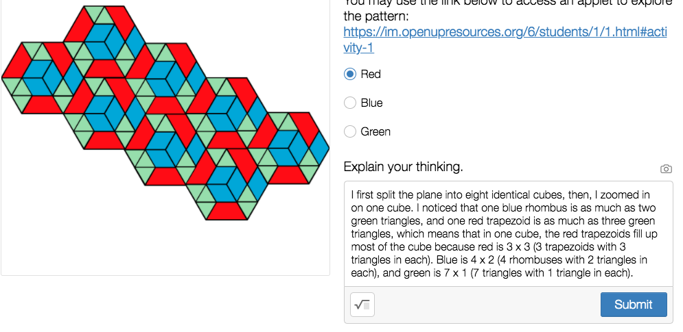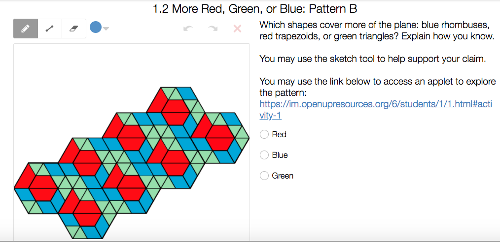 The other day, I asked my students to determine which shape covers more of the plane: blue rhombuses, red trapezoids, or green triangles. This task comes from IM 6-8 Math (Grade 6, Unit 1, Lesson 2), and it was adapted for Desmos by Cindy Whitehead (@finding_EMU).