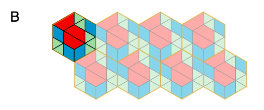 “I noticed that there are hexagons within the shape. I traced one, and tried to see out of one of them which one would take up the most space. I’m still debating on that. I kind of think that red wins over now, because… if you put red in the middle, it would equal a hexagon.” Ibrahim circled the three blue rhombuses that made up that same hexagon in the middle. “I don’t know. I just think red is bigger.”