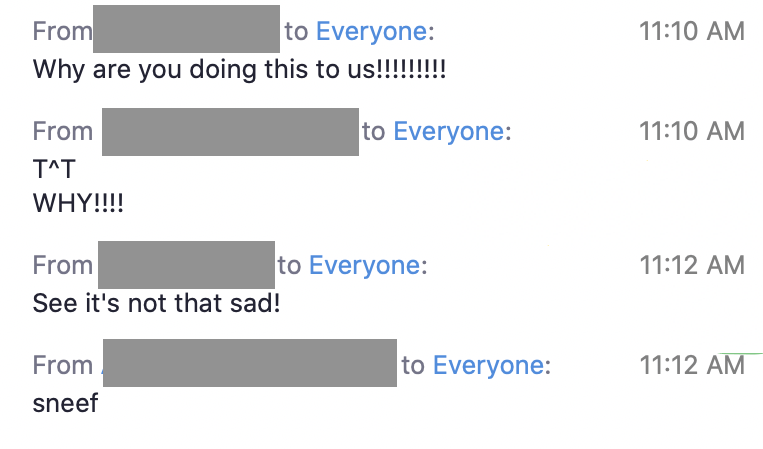 At certain points during the graph, I stopped to elicit from students how they felt. In some of my classes, students took on this task somberly. These students were more likely to write how they felt in the chat than unmuting themselves. Sharing feelings is a risk; I am not surprised that students preferred writing it instead of saying it out loud.