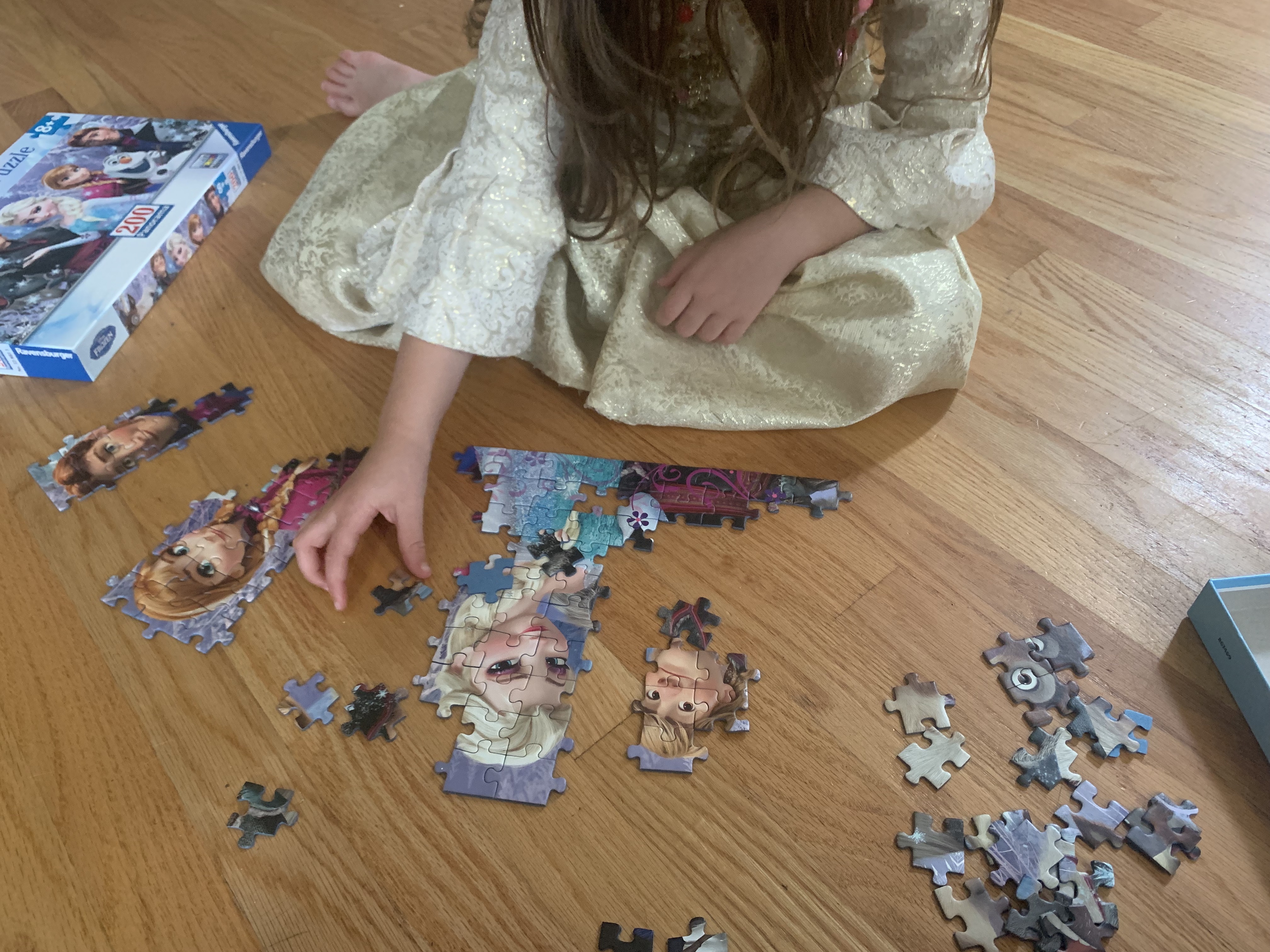 Soon, she had completed a long strip with Elsa’s face, stretching from the top edge of the puzzle down to the bottom.