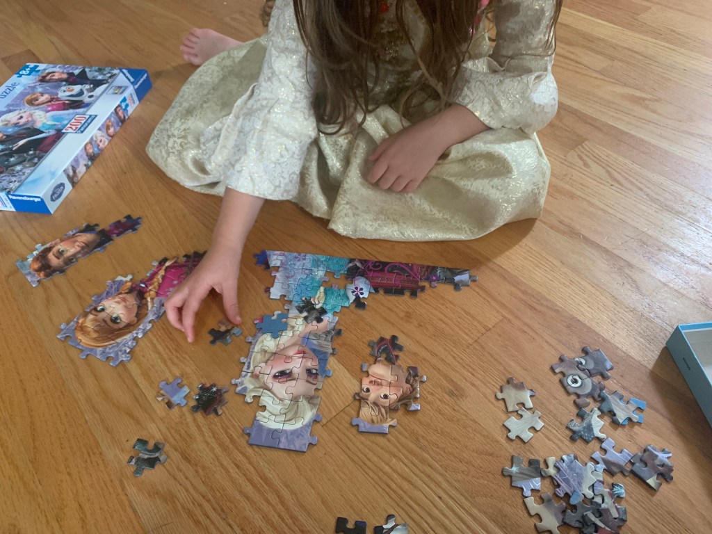 This morning, my 5yo (S) and I worked on a puzzle: 200 pieces depicting the main characters from Frozen. She started on it while I made breakfast for the family. By the time I was ready to join her, she had completed several of the faces from the tableau. “You can sort some of the pieces by color,” S offered me.
