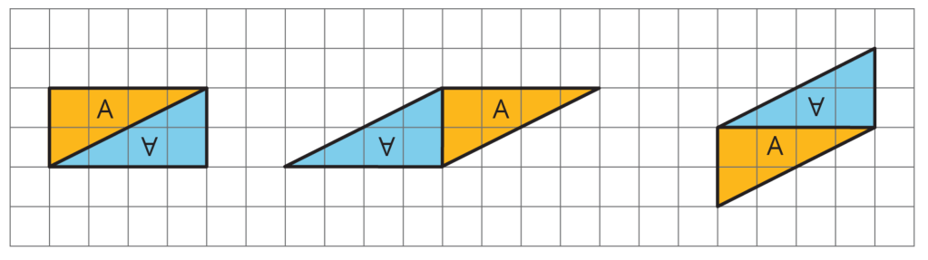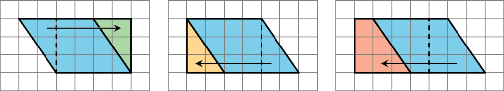 Later, in sixth grade, students learn how to find the area of polygons by decomposing, rearranging, and composing shapes. They start with rectangles — using the familiar length • width — and then explore how parallelograms can be decomposed to form rectangles.