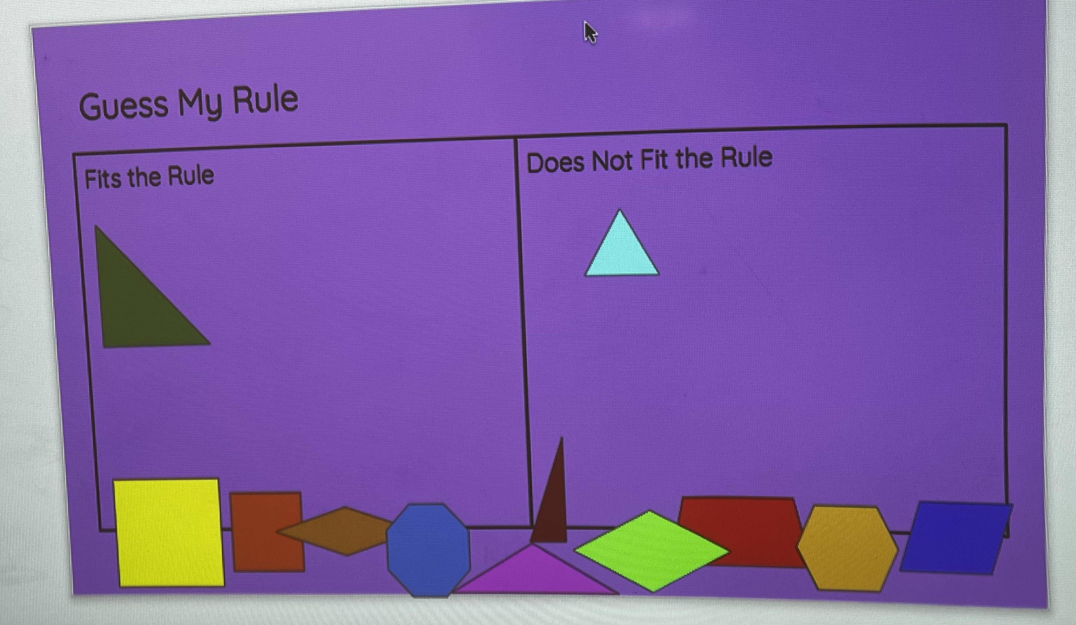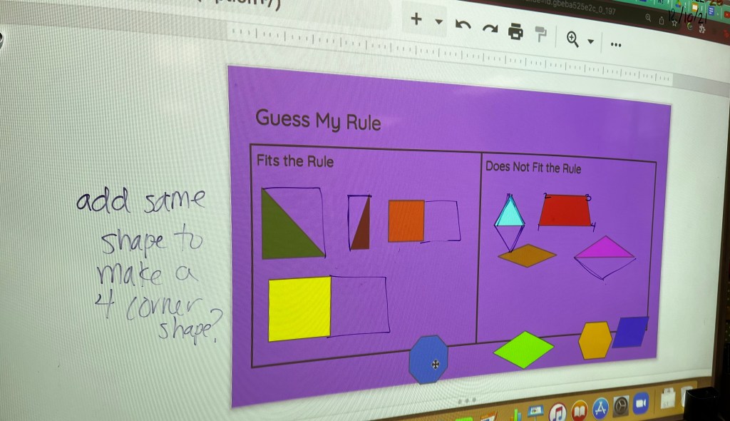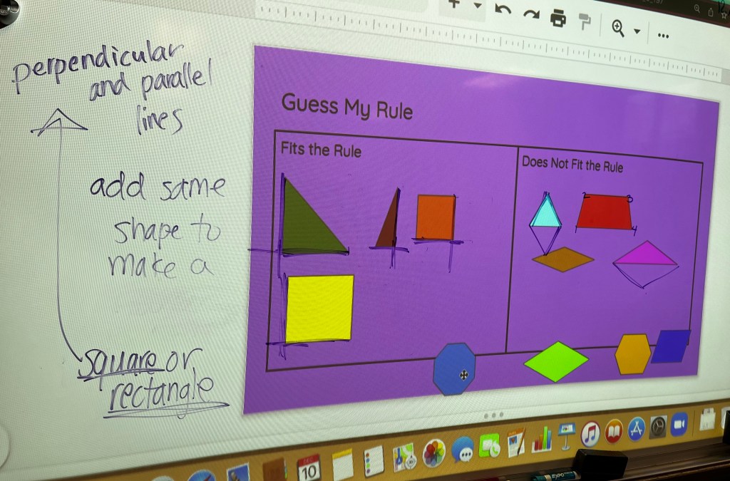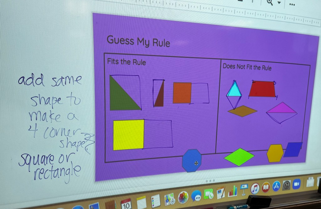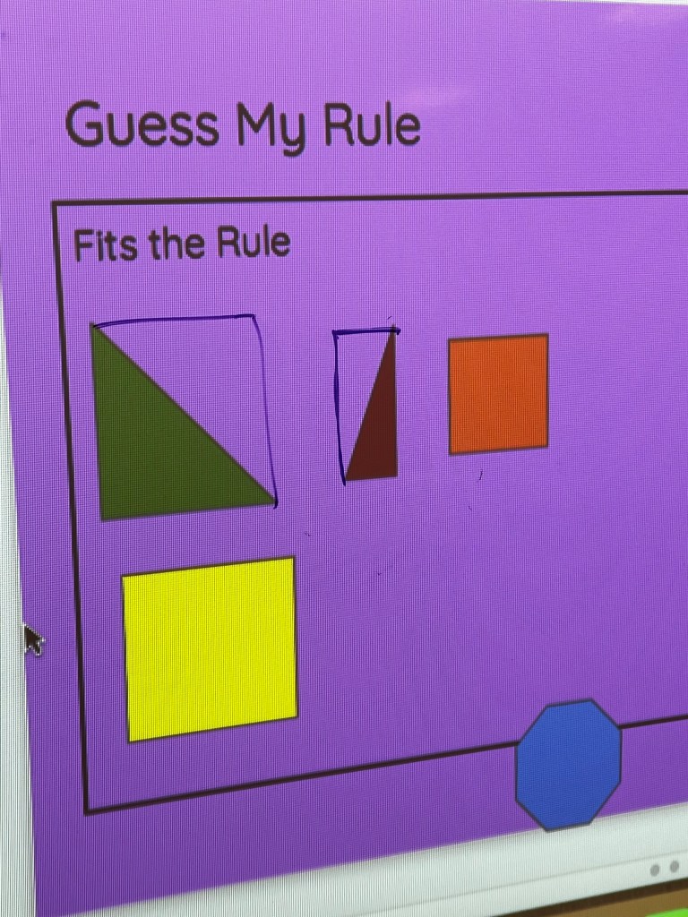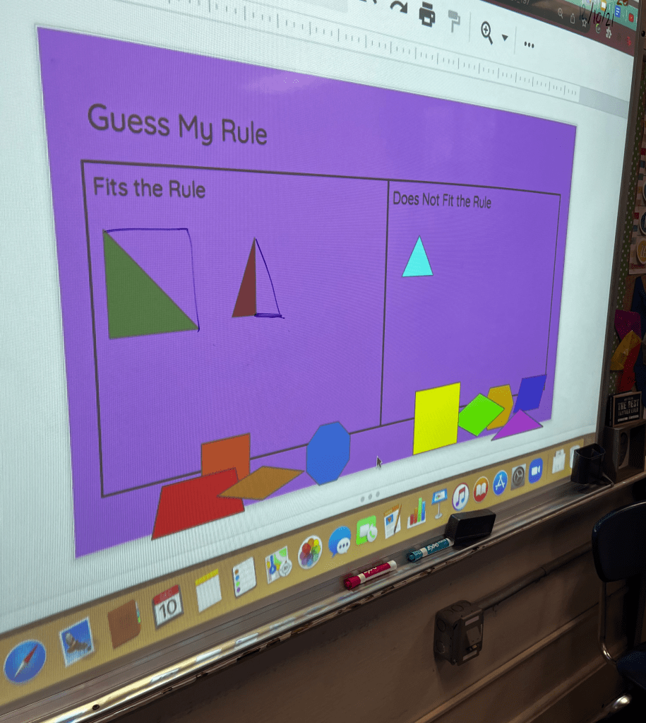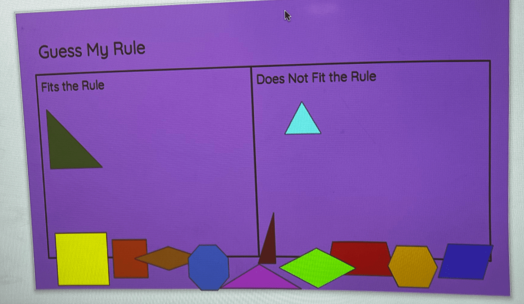 “This shape fits my rule,” said 4th grade teacher Ms. Cohen, moving the green right triangle to the left side of the board. “And this shape,” she continued, dragging the blue equilateral triangle” doesn’t fit my rule. Does anyone want to try to place another shape?
