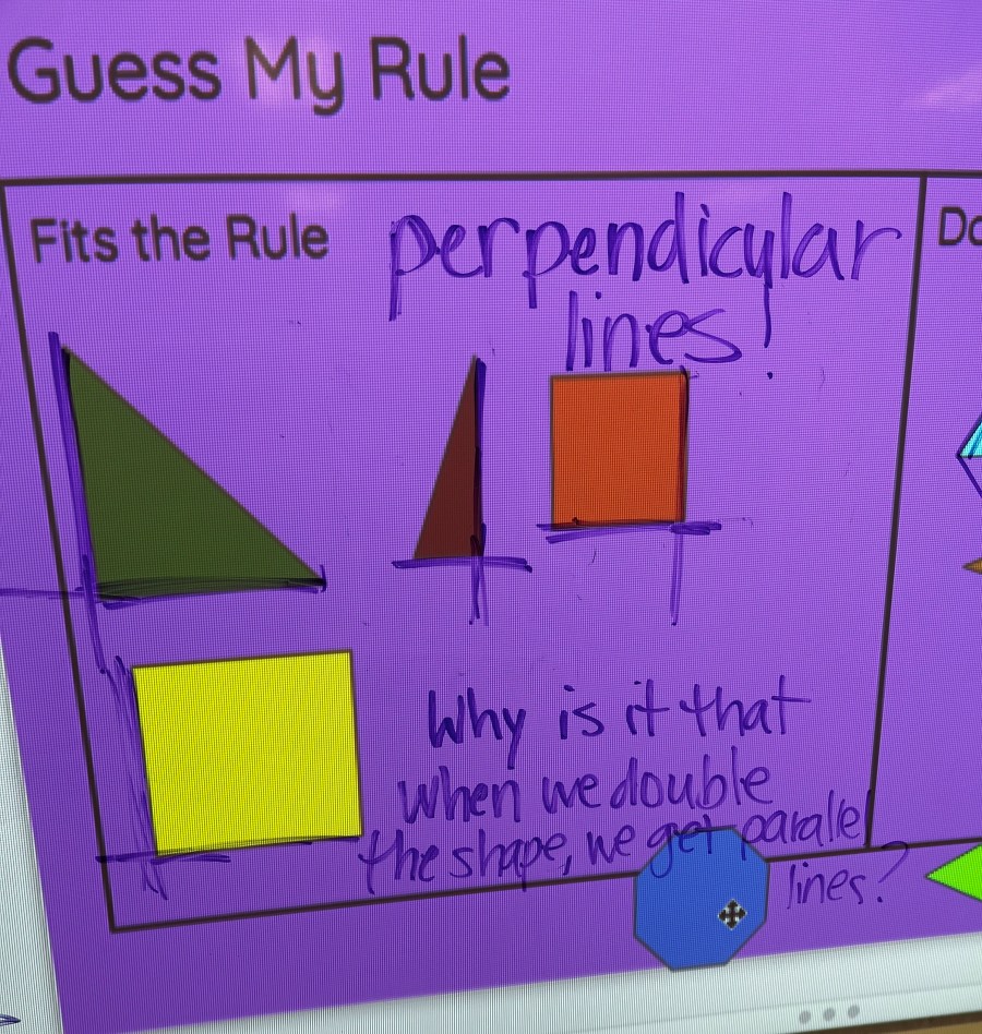Students were having all of these ideas about the properties of these shapes intuitively. We had only briefly introduced the idea of parallel and perpendicular lines in the previous lesson, but they didn’t seem to be using those words just yet. They were using a mix of formal mathematical language and their own natural language. The figures that fit the rule weren’t pointy if you doubled them, even though some of the triangles were pointy on their own. What was that about?