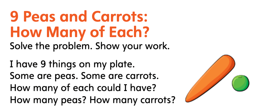 Today, the first graders revisited “Peas and Carrots.” They had spent several days exploring part-part-whole thinking in the context of games like “how many are hiding?” and “counters in a cup.” The classroom teacher and I wondered what new thinking students might have.