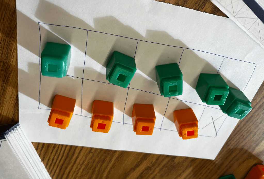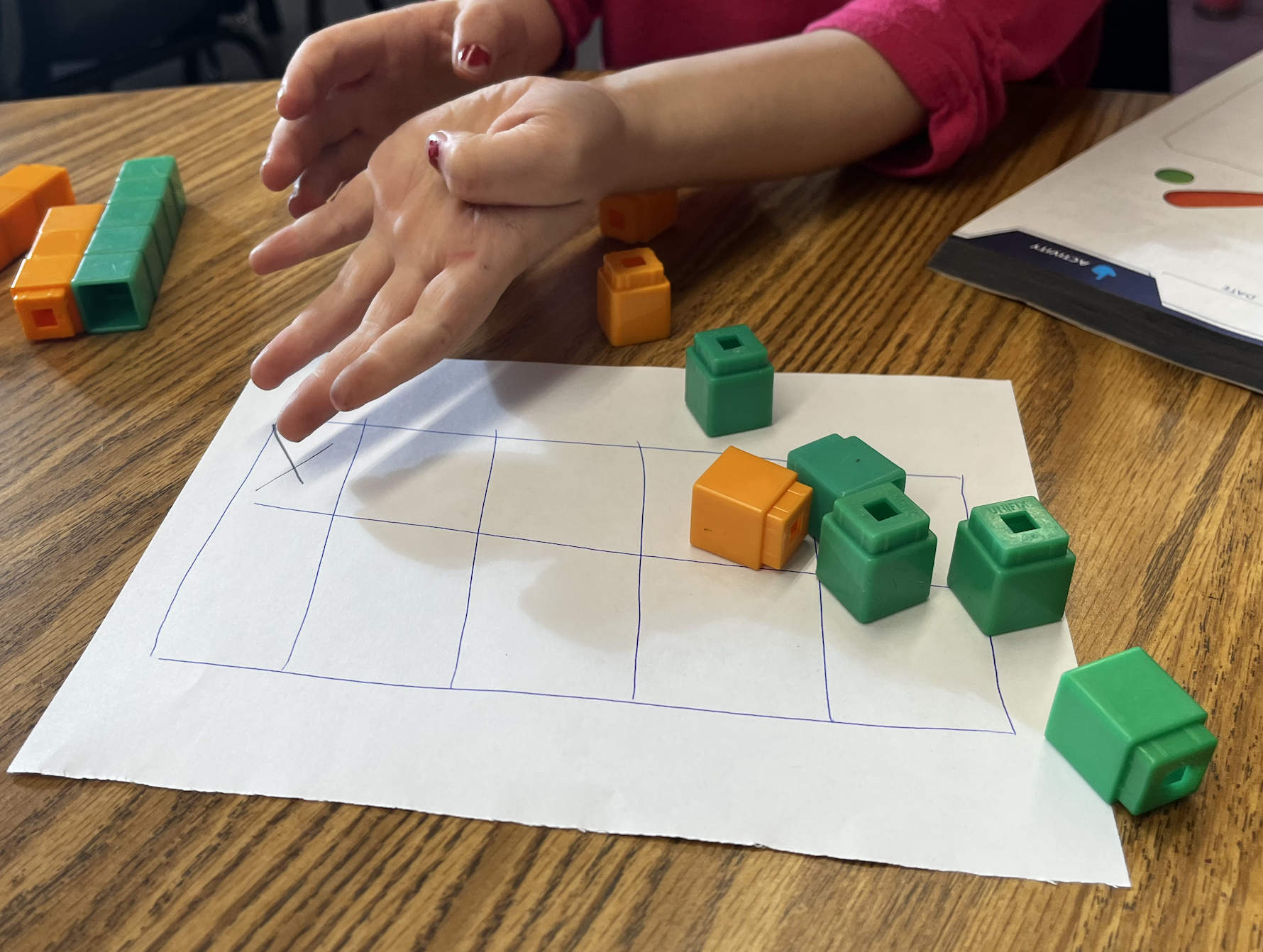 Gracie scrunched her nose, and pointed to the name tag. “Look. I took 5,” she started, gesturing to the green cubes. “And then I needed 3 more.”