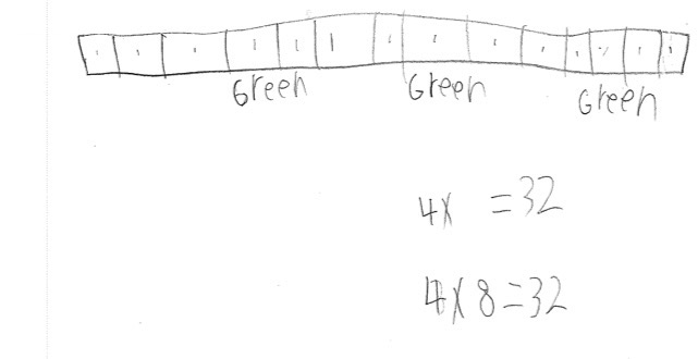 Felix started out drawing a model of the train, with every 4th square labeled “green.” It took only three iterations for Felix to notice the pattern. “Oh, so it’s going to be 4 x __ = 32!” he announced, as he recorded the missing factor equation on paper. He looked up towards the ceiling, tapped his fingers a few times, and recorded 4 x 8 = 32.