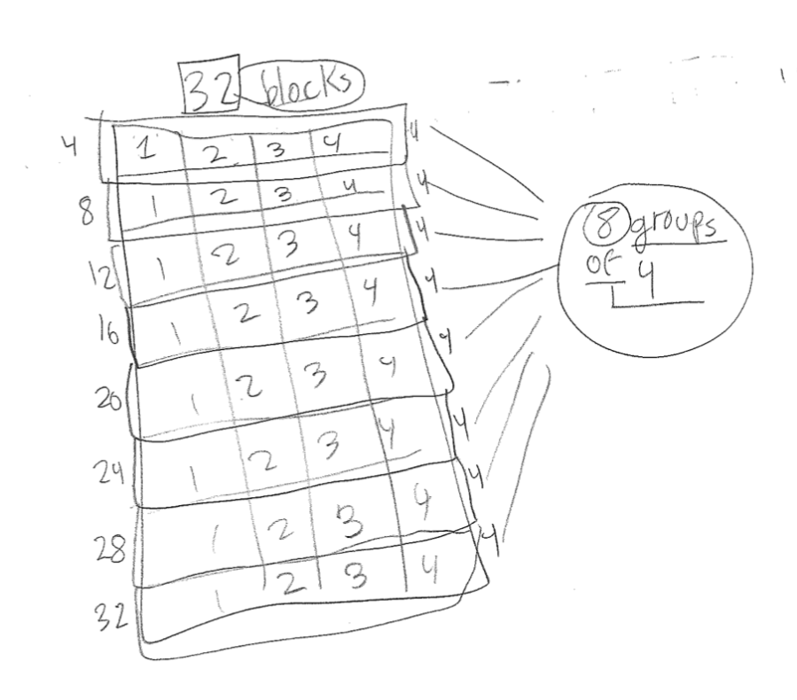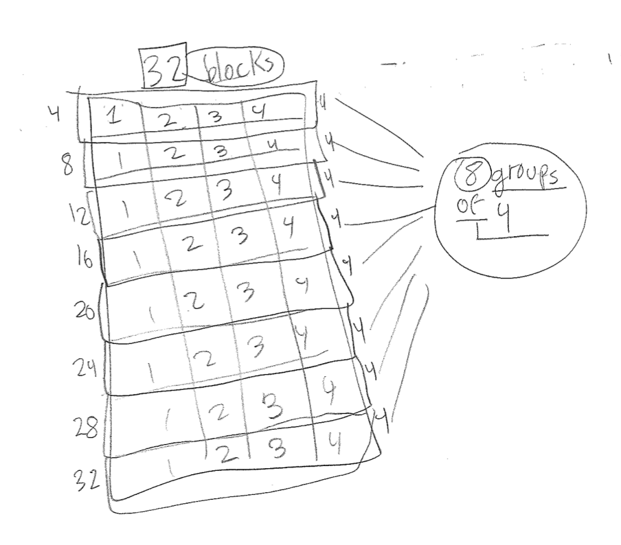 She then labeled the layers to show how many groups of 4 there would be in the train with a length of 32.