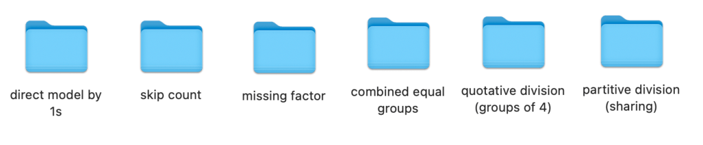 Caitlin and I poured over the student work samples. I started to think about buckets that we could put the student work into: direct model by 1s, skip counting, thinking of division as missing factor multiplication, etc.