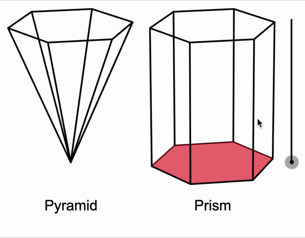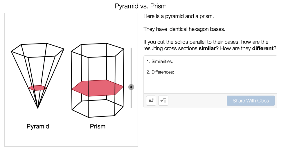 In Desmos 6-8 Math (Grade 7, Unit 7, Lesson 9: Slicing Solids), students play around with describing the cross sections of different prisms and pyramids. Here, in activity 2 (screen 6), students compare and contrast the cross-sections of figures with the same base.