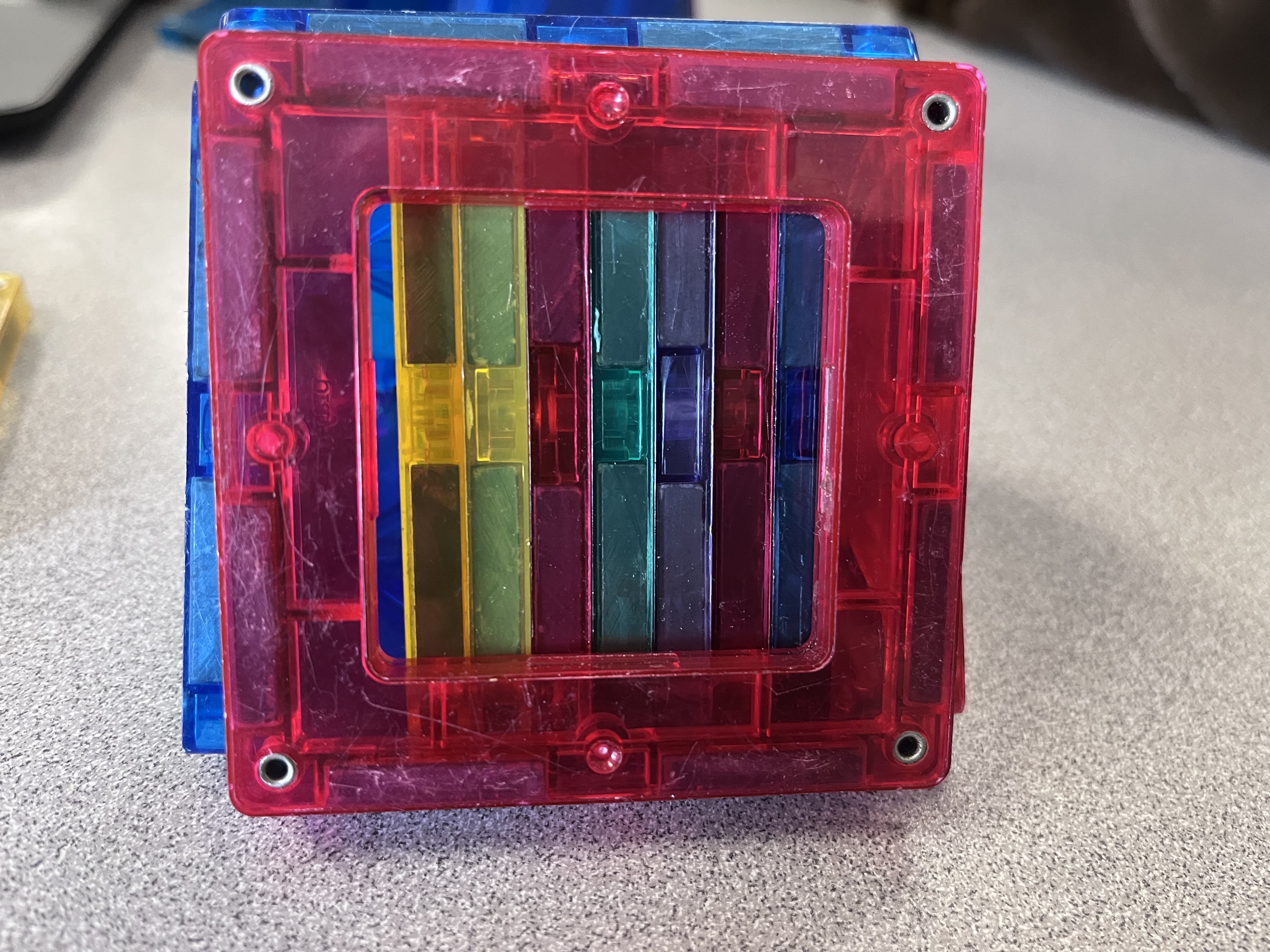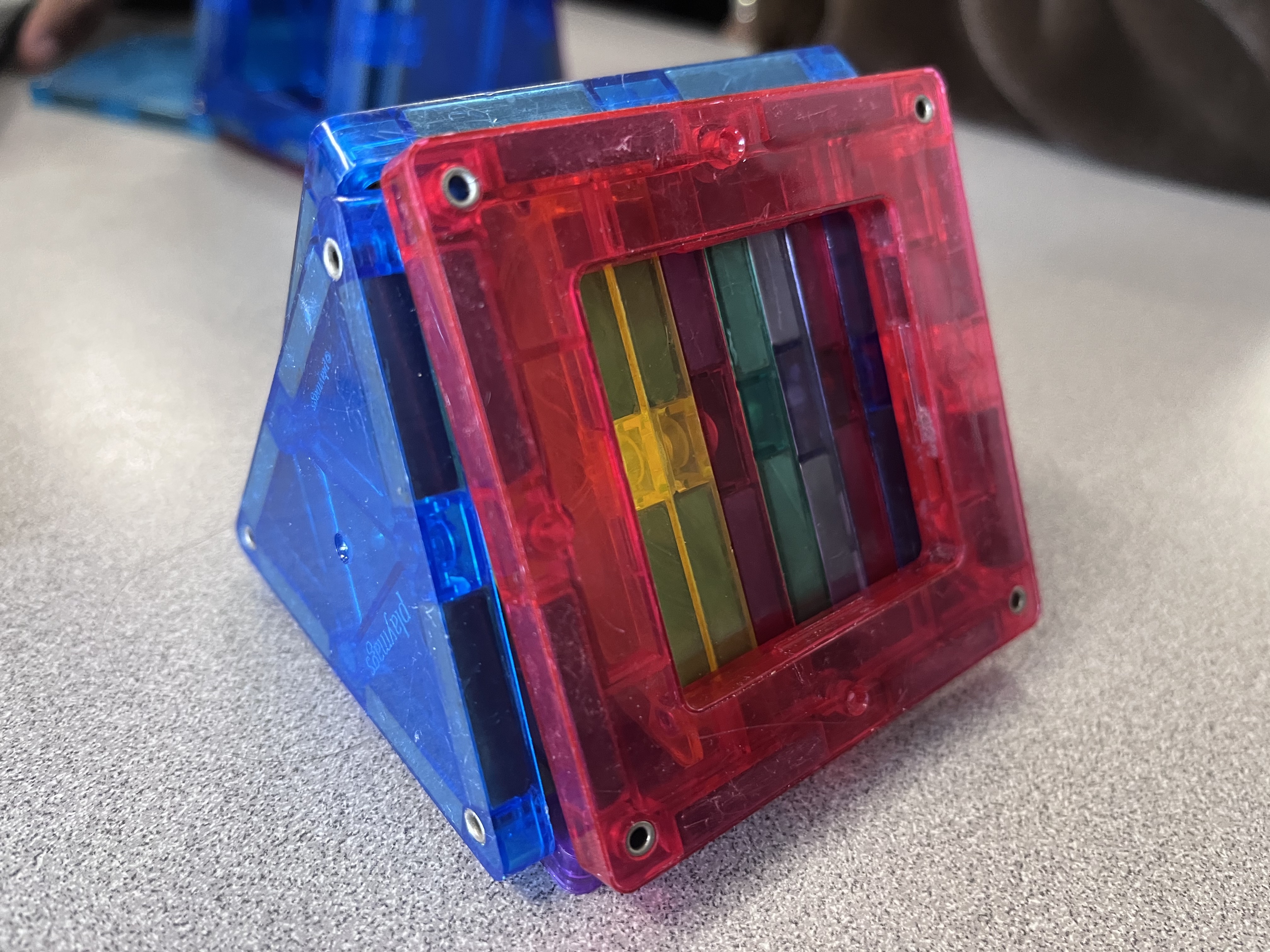 The images above show a triangular prism built out of magnatiles. (I have no financial stake in magnatiles, but I will say that they work brilliantly for 7th grade geometry!) Turning the figure to the side reveals that we can compose it out of stacked layers of congruent equilateral triangles — indeed, each cross-section parallel to the base will yield a figure congruent to the base! It doesn’t matter where you slice. This is also an application of the concept of infinite density, introduced in the study of decimals (6.NS.C.6).