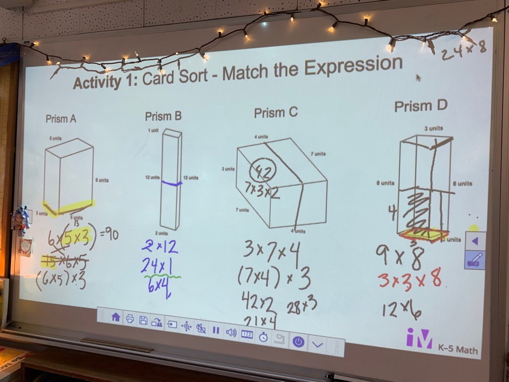 Then, when the common core came out, I gained new appreciation for use of area of the base multiplied by the height. It is not only equivalent but connects better to work with prisms without rectangular bases that happens in middle school — something I couldn’t see as easily when I was immersed fully in the world of 4th.