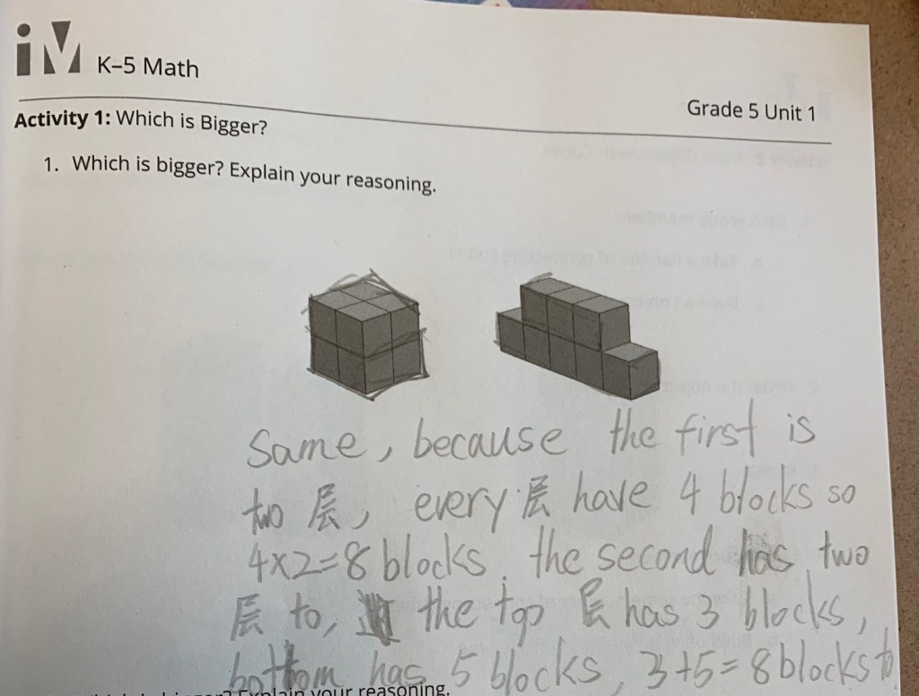 This student speaks Mandarin natively. She did not know the English word for “layer,” so she recorded it here in Mandarin (层). “[these blocks are the] same, because the first is two layers (层), every layer (层) have 4 blocks, so 4 x 2 = 8 blocks. The second has two layers (层), the top has 3 blocks and the bottom has 5 blocks, 3 + 5 = 8.”