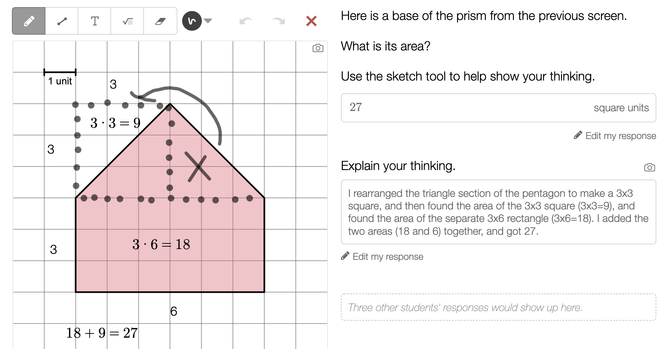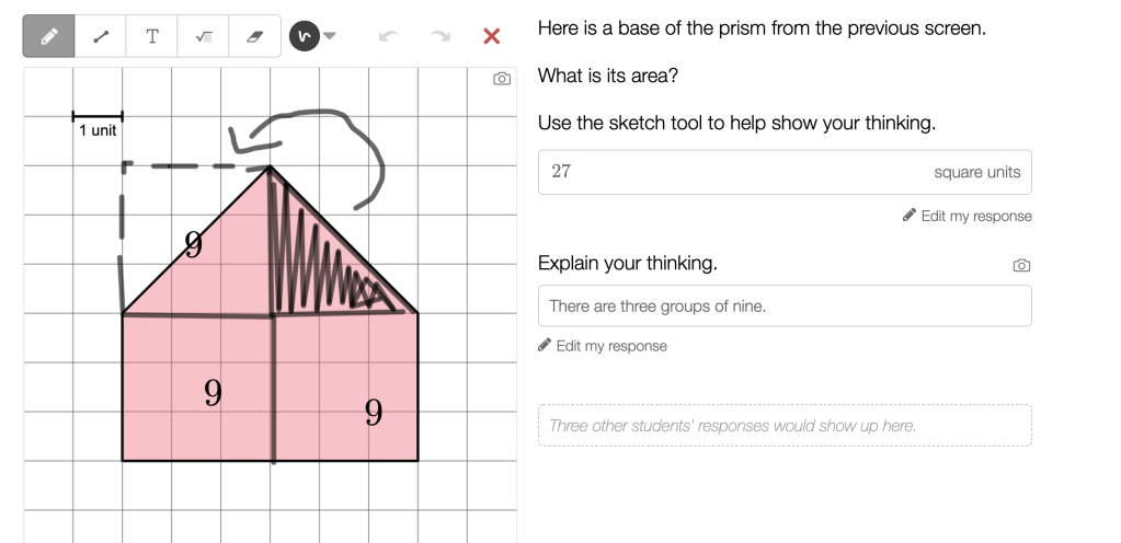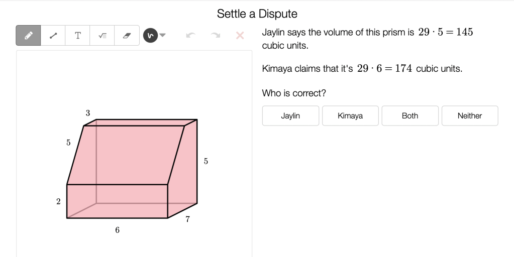 Fifth graders are wrestling with solid figures, sometimes tangibly (blocks, or built out of multilink cubes), and sometimes in 2D representations. Here, in an activity from Illustrative Mathematics Grade 5, Unit 1, Lesson 1, a student is wrestling with how to compare figures. The ambiguity here — “which is bigger?” — is intentional, to draw out student ideas about size and measurement.