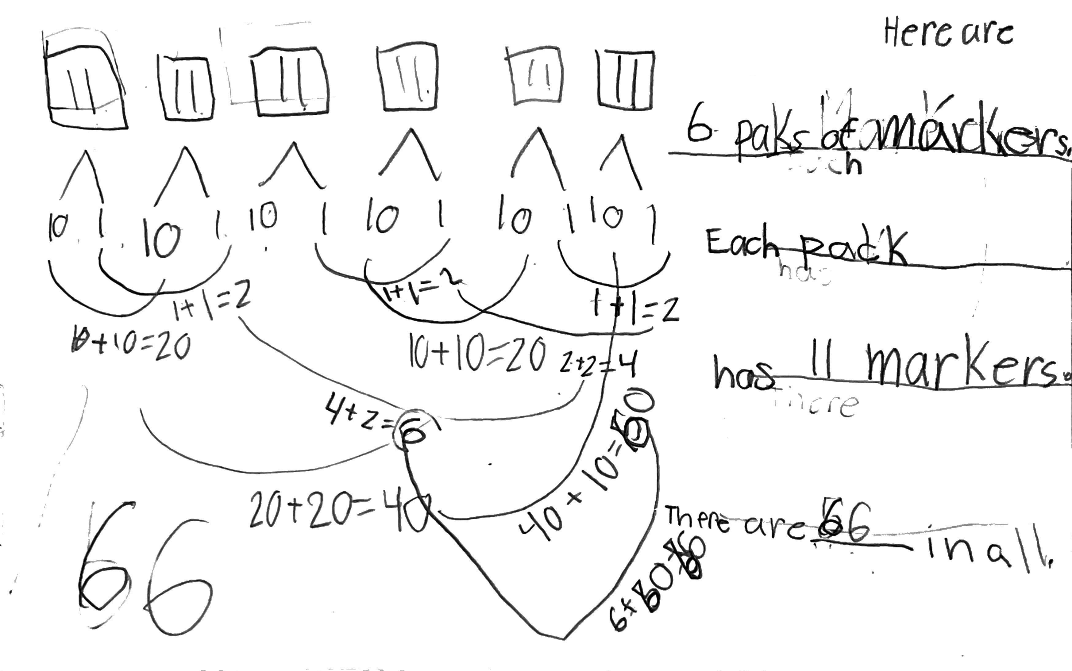 It’s beautiful! She created her own equal groups situation. I love how she decomposed the packs of 11 markers into 10s and 1s, and then worked diligently to combine them.