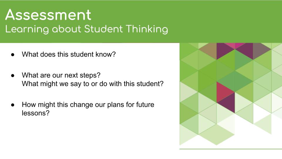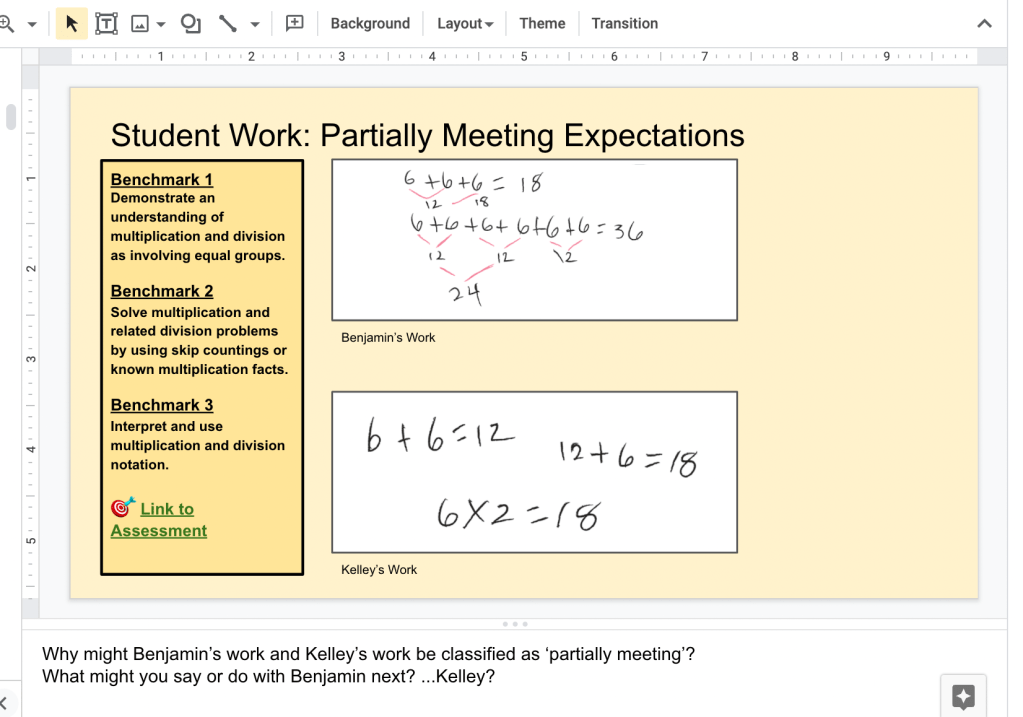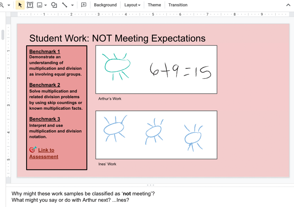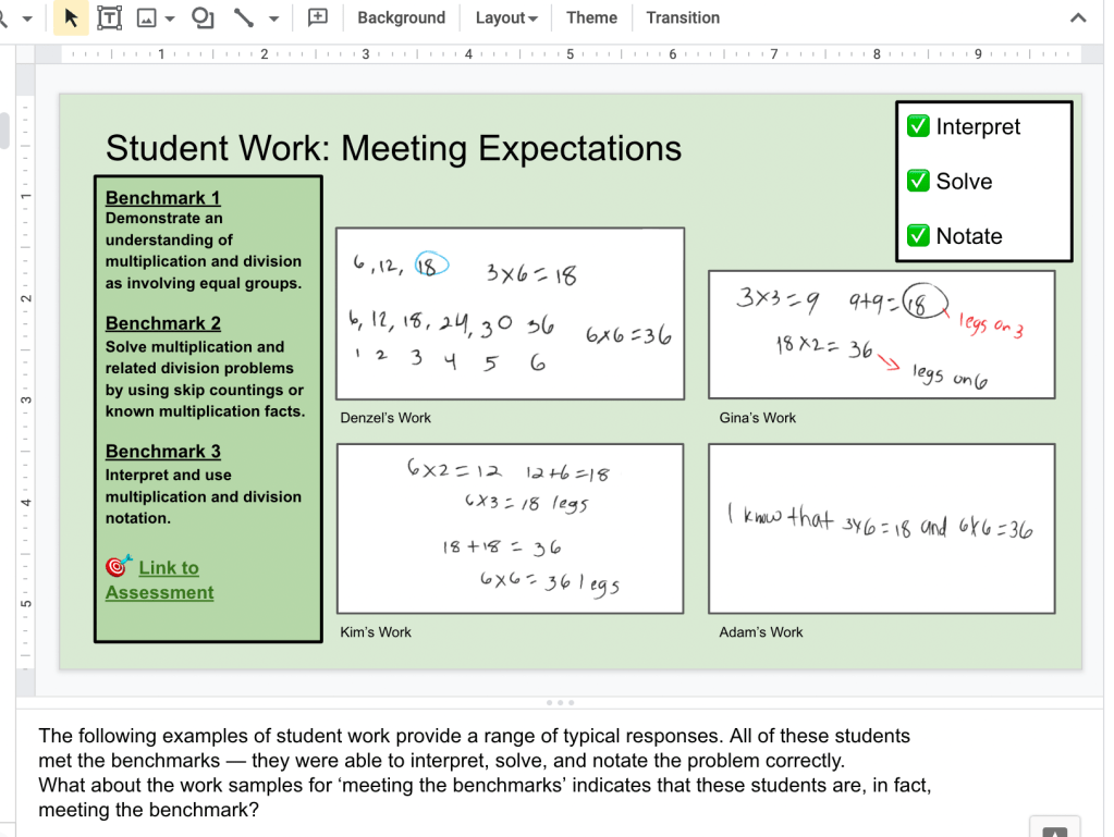 So how do we help teachers engage with these PD opportunities that are baked into the curriculum? Over the summer, I worked on a PD project with another math specialist from my district (Tara Washburn, my unofficial mentor). We designed slide decks for individual units that outlined the story of the unit, listed the mathematical benchmarks, and dug into an assessment. The goal is to orient teachers to the mathematics of the unit while remaining firmly anchored on student thinking.