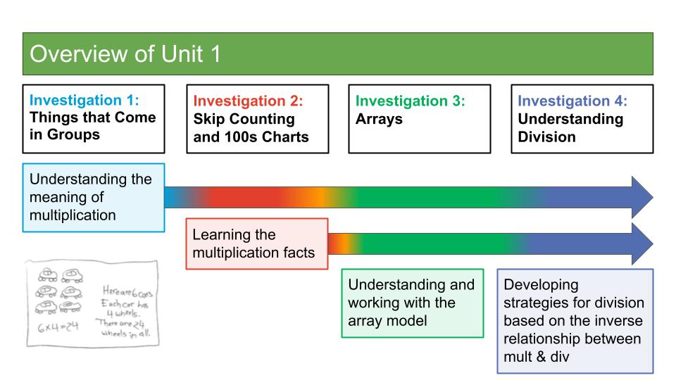 Here’s one slide from the section about the story of a unit. The colored arrows indicate that this is a main math idea that continues across multiple investigations within the unit.