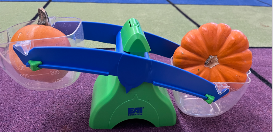 “What do you predict the scale will look like if Anaya’s wide pumpkin weighs more?” Students positioned their arms tilted down, and up, and every which way. “What about if Anaya’s wide pumpkin weighs less?” The same wild predictions.