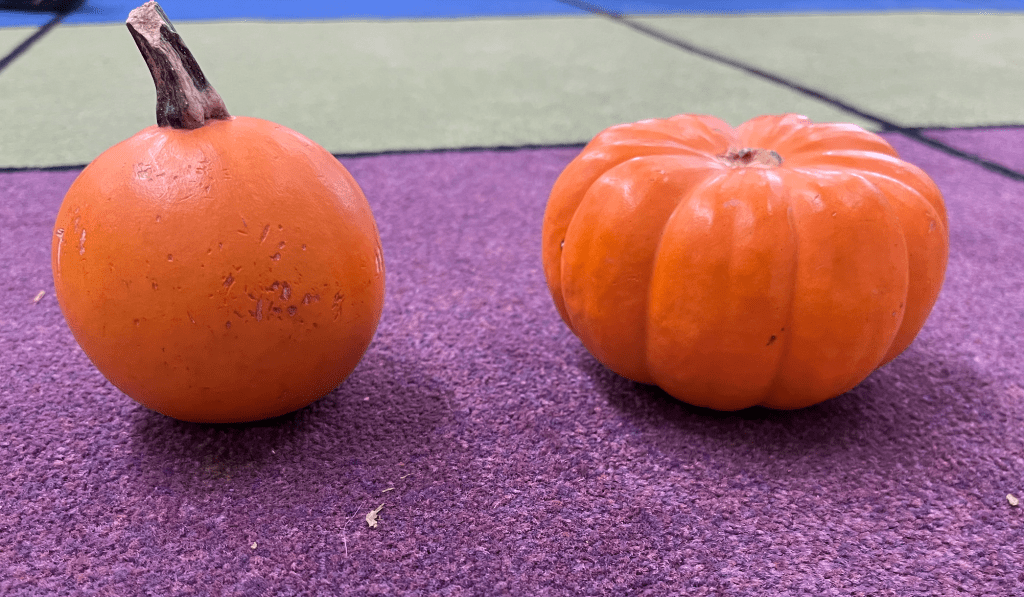“Okay, so point to the pumpkin that’s bigger if we think big means tall.” I prompted. The students pointed to Aoi’s. “And now point to the pumpkin that’s bigger if we think big means wide.”