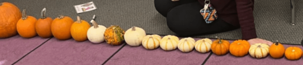 “Okay, so for some of us big is tall. A pumpkin could be tall or short,” Ms. Lombardi said. “And then Jonah said that the pumpkins could be wide. So they could be wide,” she said, indicating the width of the squat pumpkin. “Or… narrow? Is that what you’d say, Ms. Laib?”
