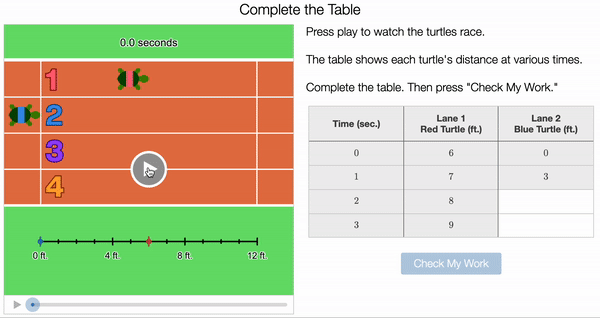 The lesson launches with students watching a video of two turtles racing: one starts about halfway down the course, and moves slowly, while the second one starts at the beginning and moves at triple the pace. Students wrote stories to describe what’s happening.