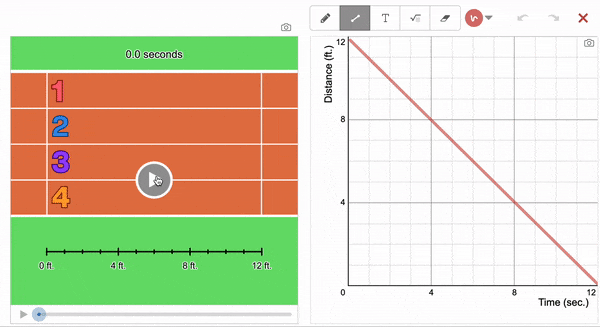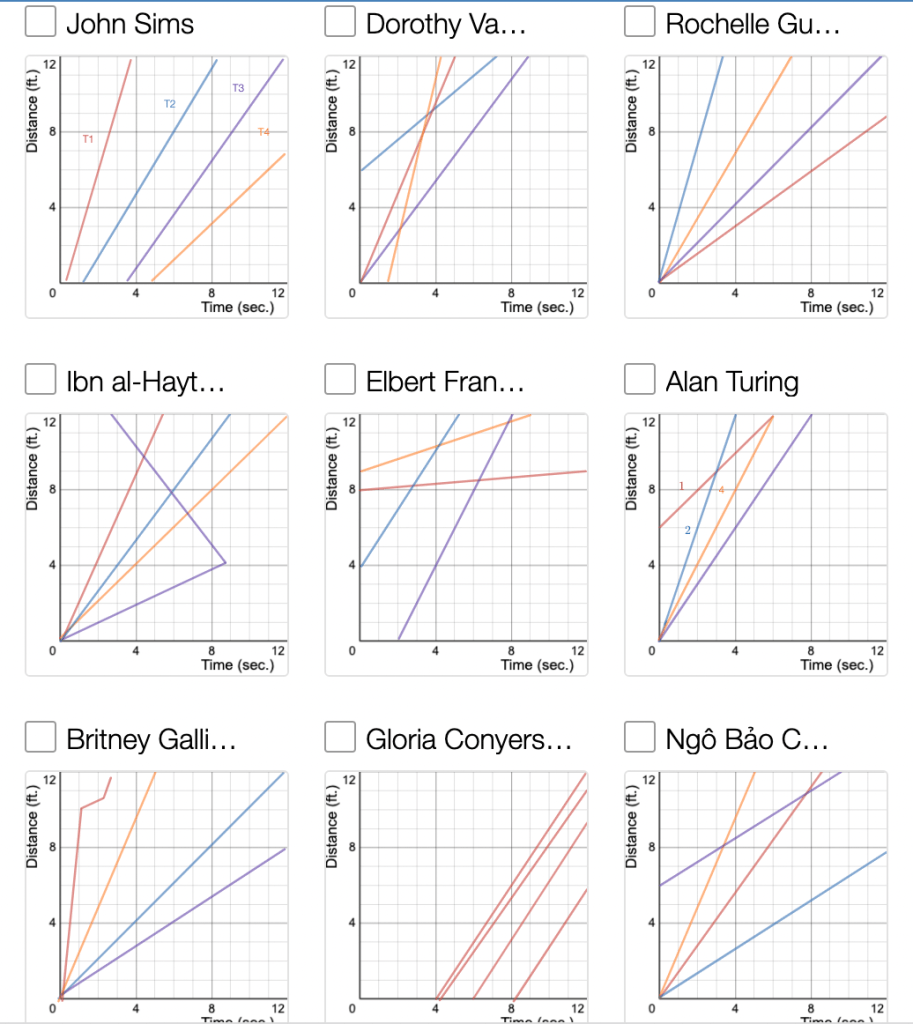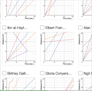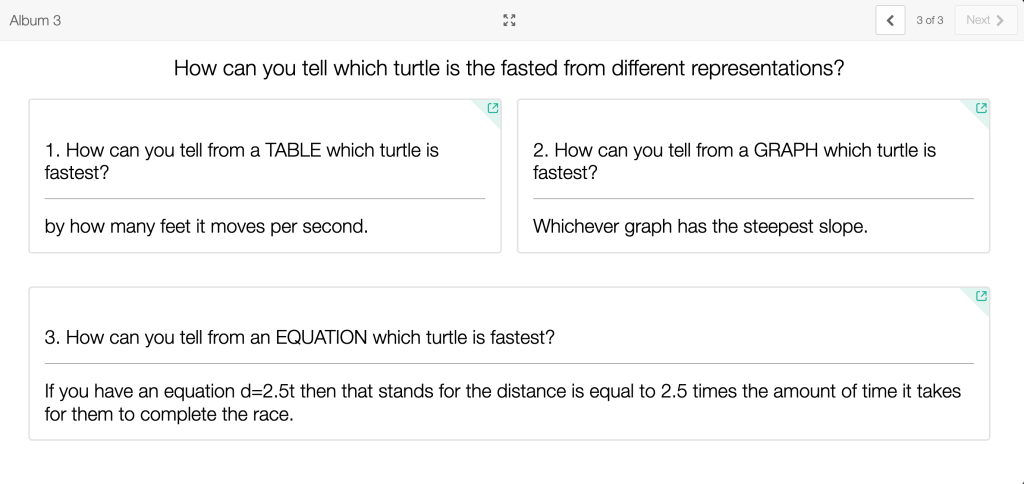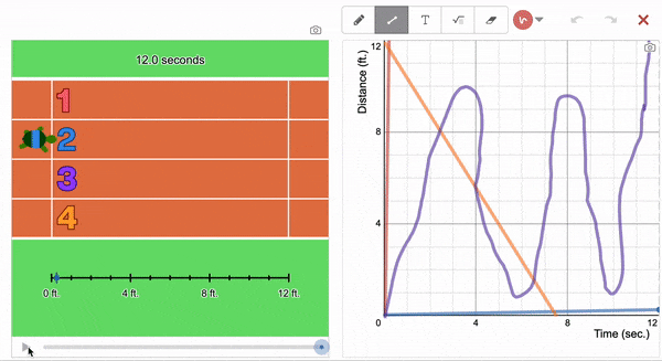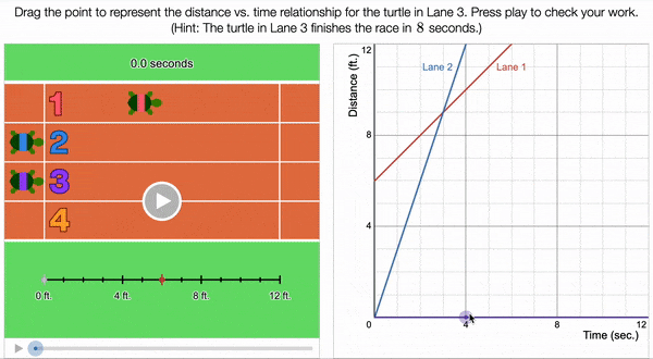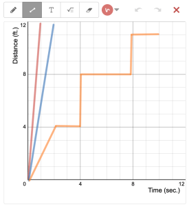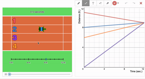 Students were then asked to calculate the speed of each turtle. Some students noticed that you could easily identify the rate for Turtle 2 (Blue Turtle). “It says 3 ft for 1 second, so it’s 3 feet per second. This is calling back all of the work we did in 6th and 7th grade around rates and proportional relationships. (There were even a few lessons on proportionality that involved turtle races.)