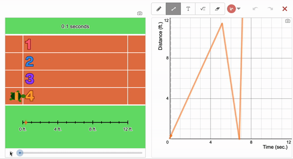 “Yes, you’re paying close attention to what the axes mean in this graph. The measurement along the x-axis — the horizontal one — is time. Then the y-axis — the vertical one — shows us the distance. What does it mean that at 3.99 seconds the turtle is a distance of 4 feet, and at 4.01 seconds the turtle is a distance of 8 feet? And what would it really look like at 4 seconds if we could take a quick picture?”