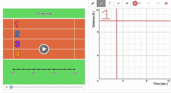 On the next screen, we added a layer of mathematical precision: tables. To support their work with the table, students now had a timer tracking every tenth of a second, and a number line revealing the turtle’s position.