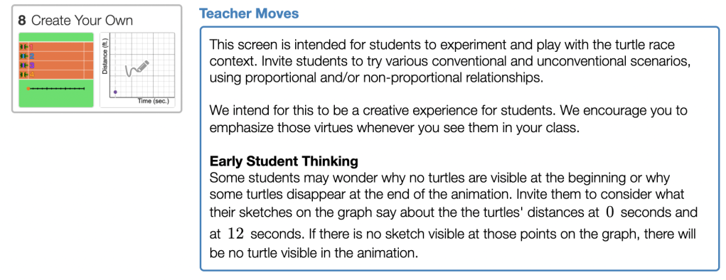 Turtle Time Trials is a gorgeously crafted lesson. (FYI it’s built into the Desmos 6-8 Math curriculum, but it’s also available as a standalone experience.) It gradually turns up the math dial, nudging a scenario from informal sensemaking to mathematical precision all within a 47 minute block. It is graceful. I scheduled myself to be in two different sections of eighth grade the day that we taught it.