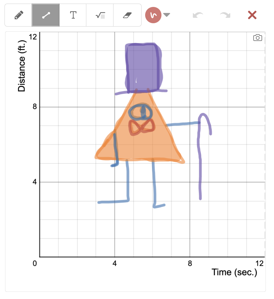 The arc of this lesson is something to behold: shifting seamlessly from tables, to graphs, to equations, and then giving students time to experiment with more creative graphic representations. The way that the Desmos activity makes the graph instantly visible as a context provides helpful feedback. Can we make the turtle go backwards? Let’s try this… hmm, that didn’t quite do it. Let’s try something else.