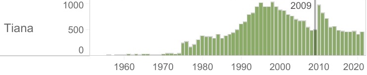 And then there are some names that experienced a short-lived Disney bump, like Tiana, the star of 2009’s The Princess and the Frog.