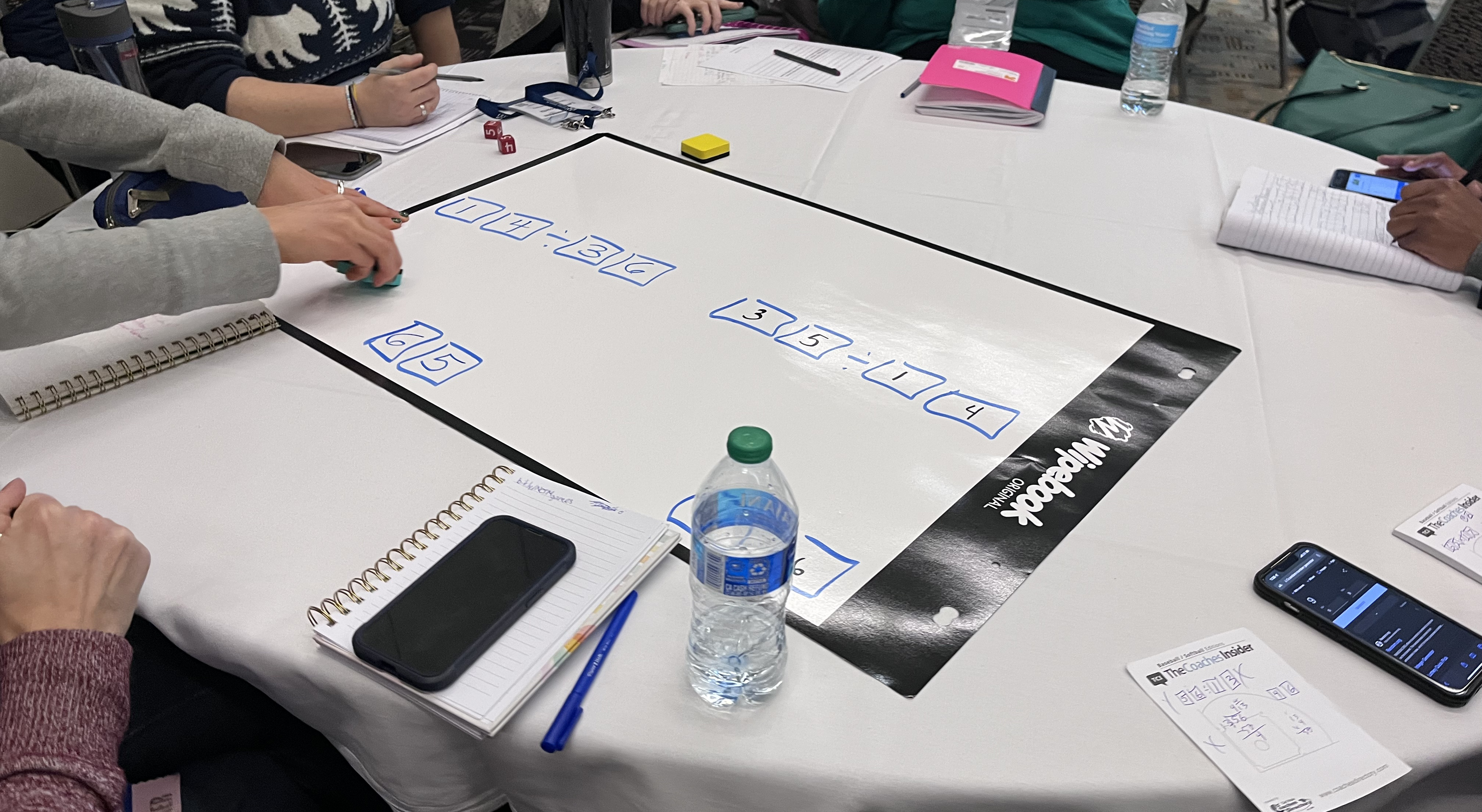 Most participants chose to write on the dry erase posters (generously donated by Wipebook) but I saw a few people writing in notebooks or on computers. Many people seemed eager to play, and a few others looked nervous. While we had wanted to use a division game — it mirrored something from earlier in the presentation — Louisa and I wondered if we’d chosen content that was uncomfortable for a few teachers. Teachers of lower elementary grades might not have had as much experience thinking about division of larger numbers.
